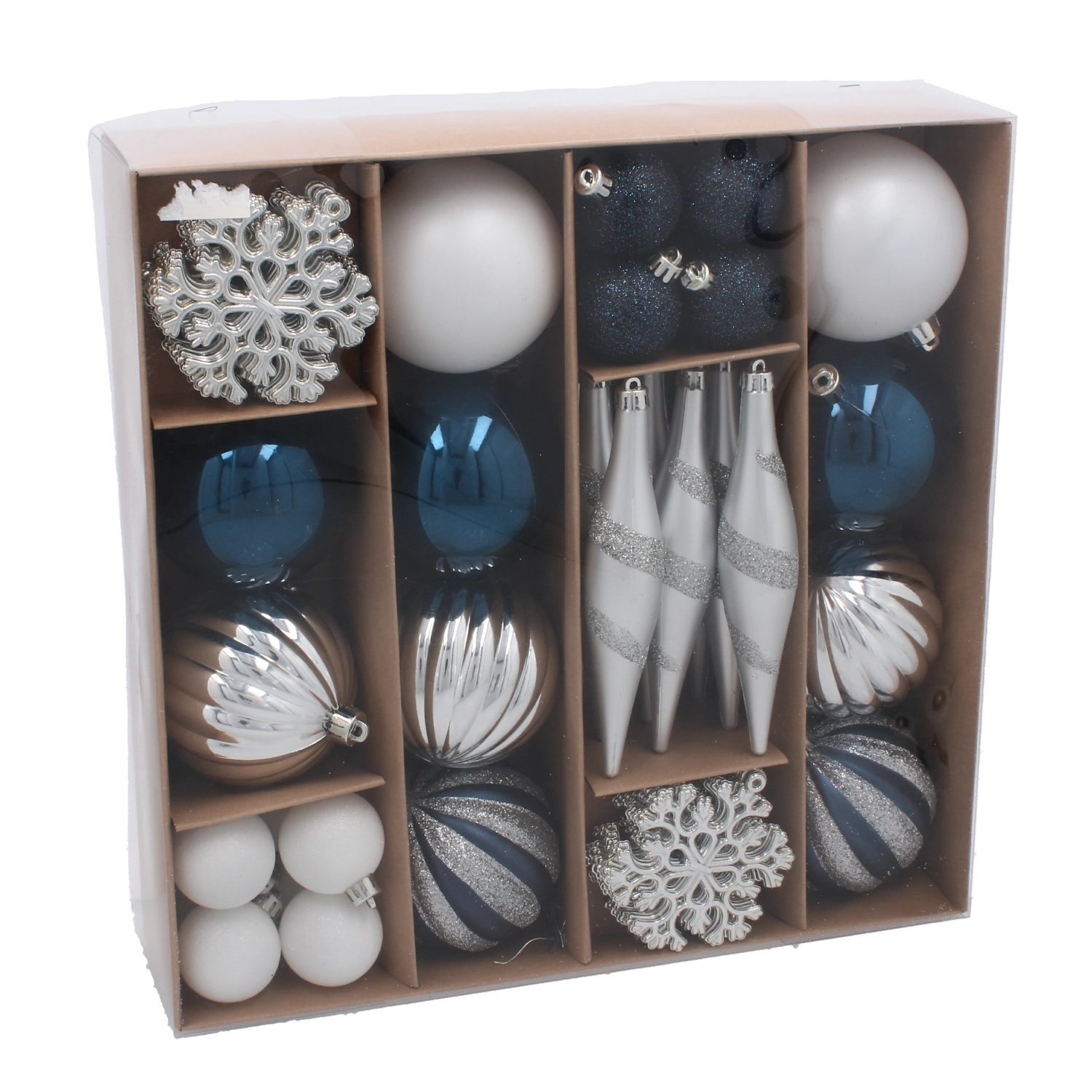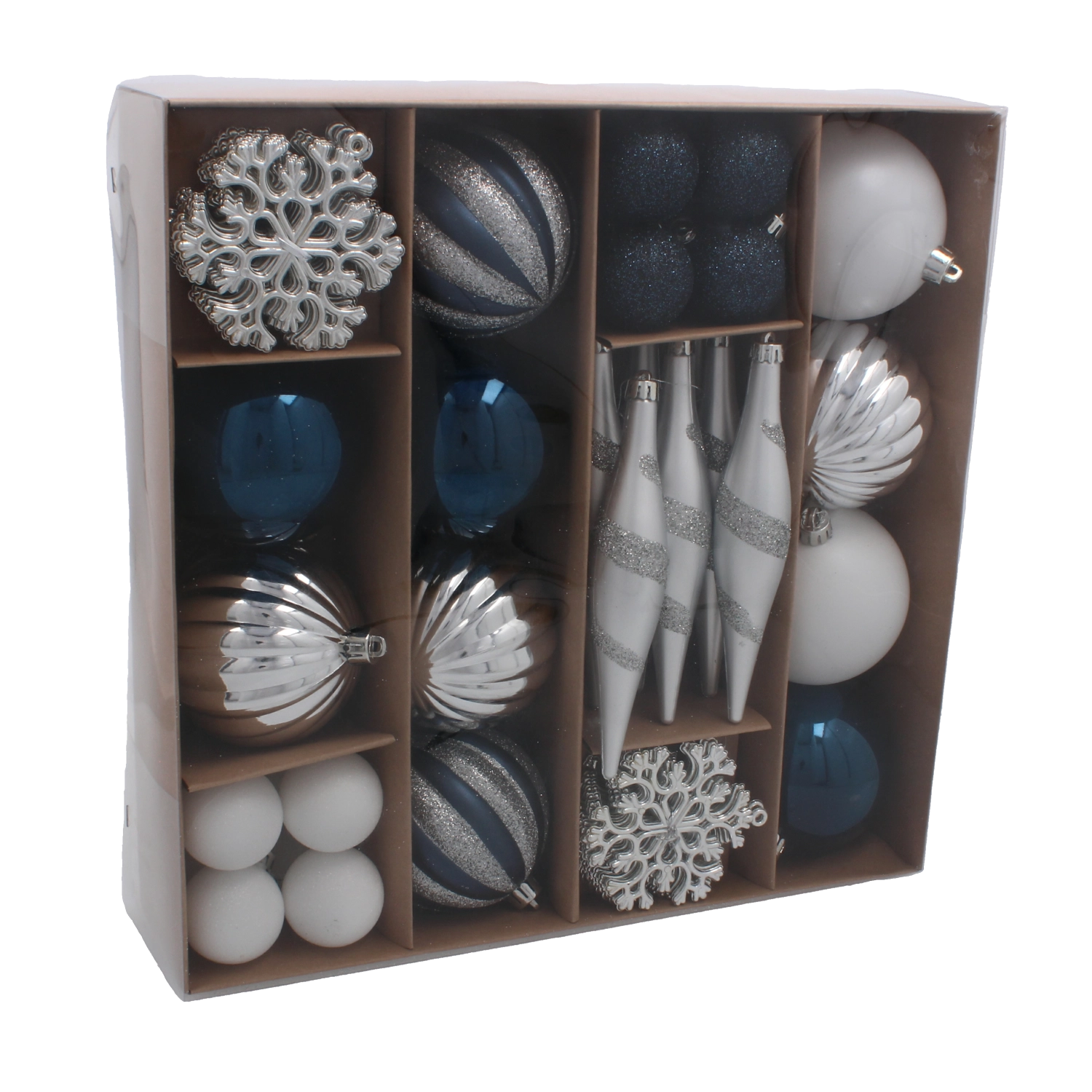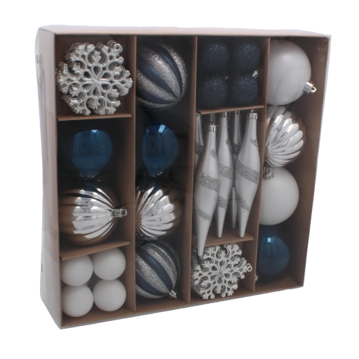 Elegancki zestaw 50 ozdób bożonarodzeniowych w odcieniach granatu i srebra doda Twoim świątecznym dekoracjom nowoczesnego sznytu i harmonii. Ozdoby wykonane są z nietłukącego się plastiku, bezpiecznego dla domów z dziećmi i zwierzętami, a dzięki lekkiej konstrukcji łatwo je zawiesić na małych i dużych choinkach. Różne kształty – od klasycznych bombek po szyszki – pozwalają stworzyć stylowo spójną kompozycję. Dostarczane w pudełku prezentowym, które świetnie sprawdzi się także jako elegancki upominek.