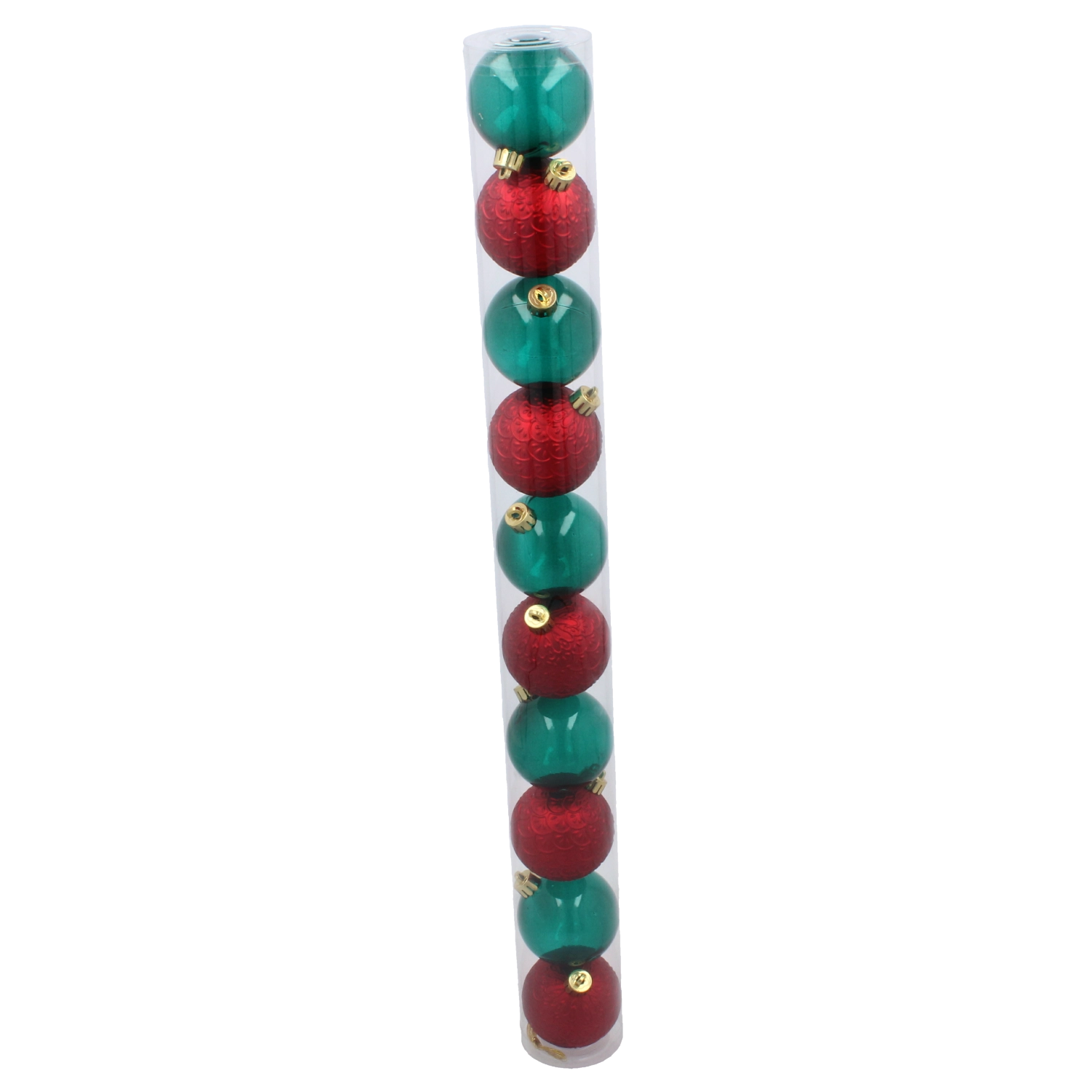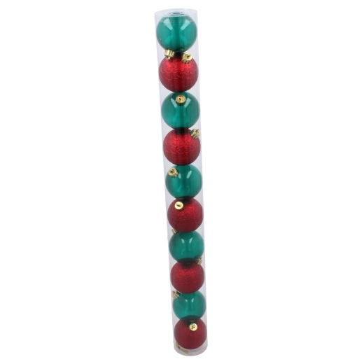 Elegancki zestaw dziesięciu ozdób choinkowych o średnicy 6 cm w połączeniu kolorów czerwonego i butelkowozielonego doda Twojemu drzewku tradycyjnego uroku. Trwały, nietłukący się materiał oraz miks błyszczących i matowych wykończeń pięknie odbija światło i zapewnia długą żywotność. Praktyczne opakowanie w przezroczystej tubie ułatwia przechowywanie i przenoszenie.