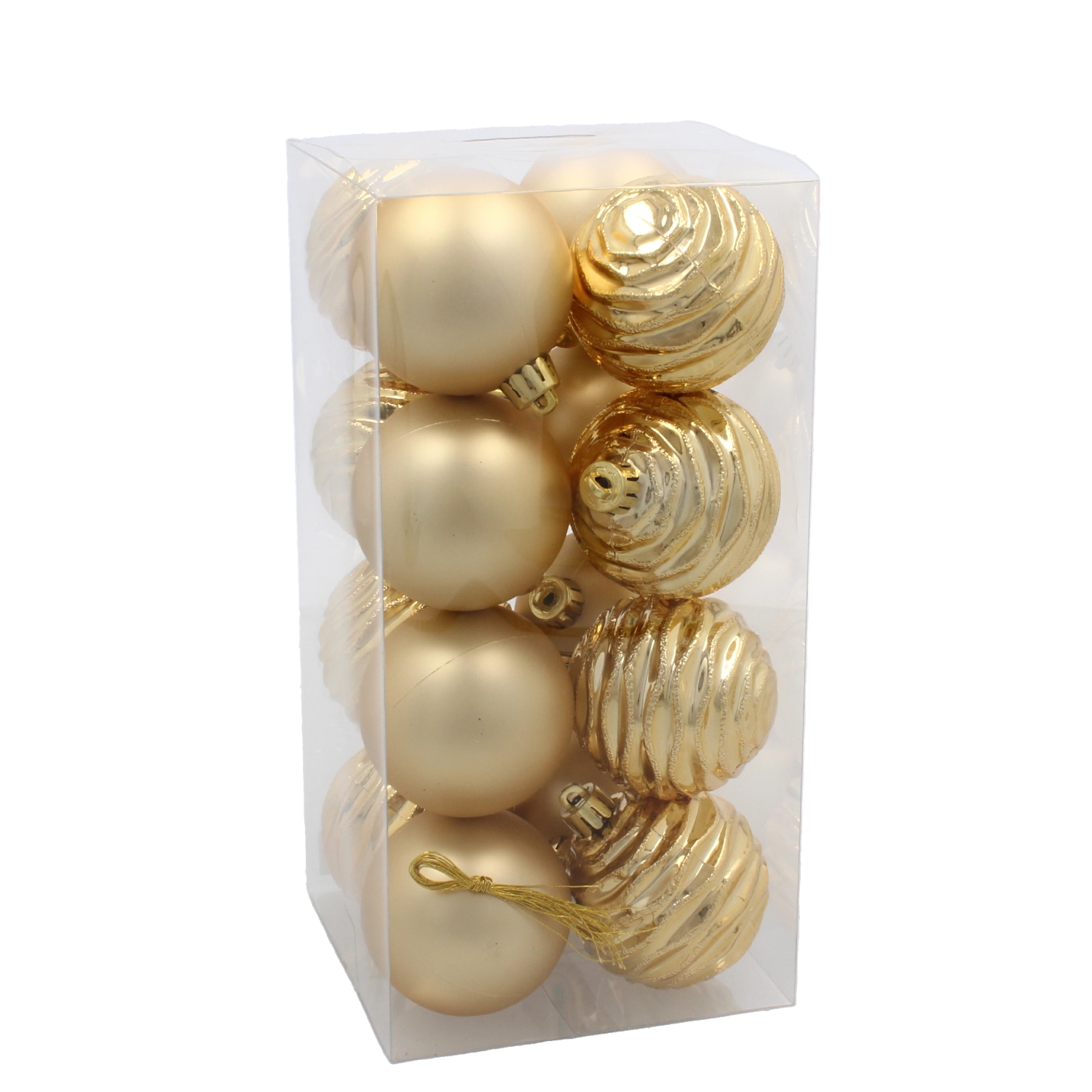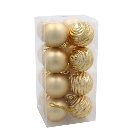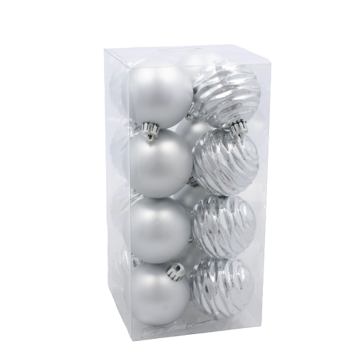 Dodaj swojej choince klasycznego blasku dzięki zestawowi 16 bombek o średnicy 6 cm w kolorach czerwonym, złotym i srebrnym. Trwałe tworzywo i błyszczące wykończenie gwarantują piękne refleksy światła oraz długą żywotność – idealne do choinek, wieńców, girland i innych dekoracji.