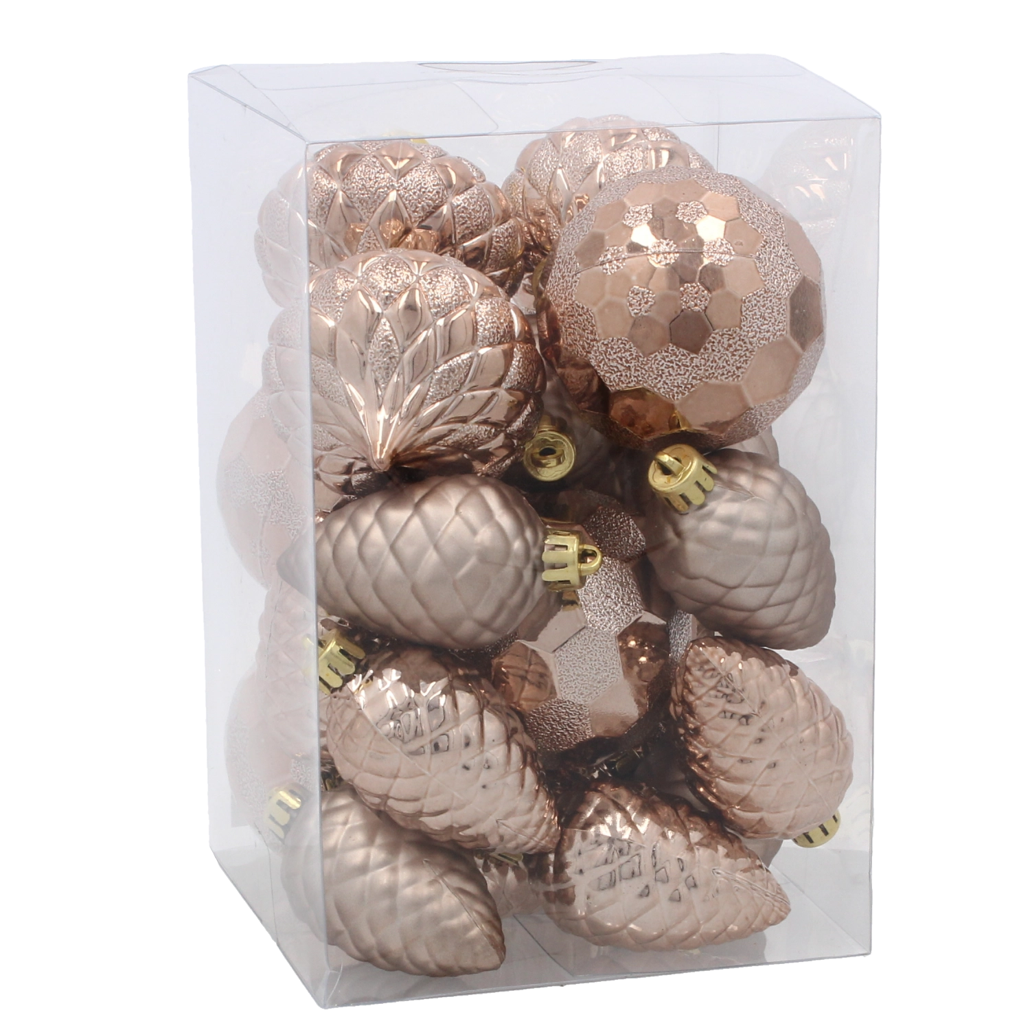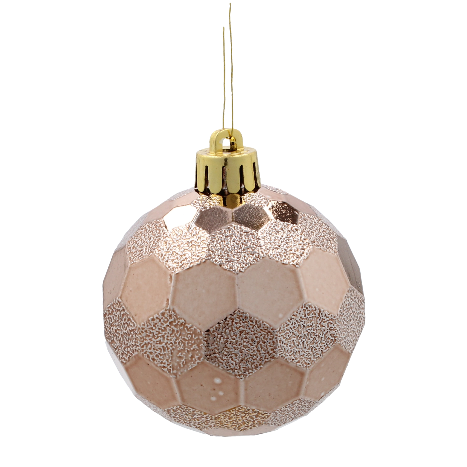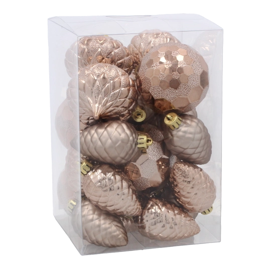 Beżowo‑złote odcienie z subtelnym metalicznym efektem rozświetlą choinkę i elegancko dopełnią ciemnoniebieską paletę.
