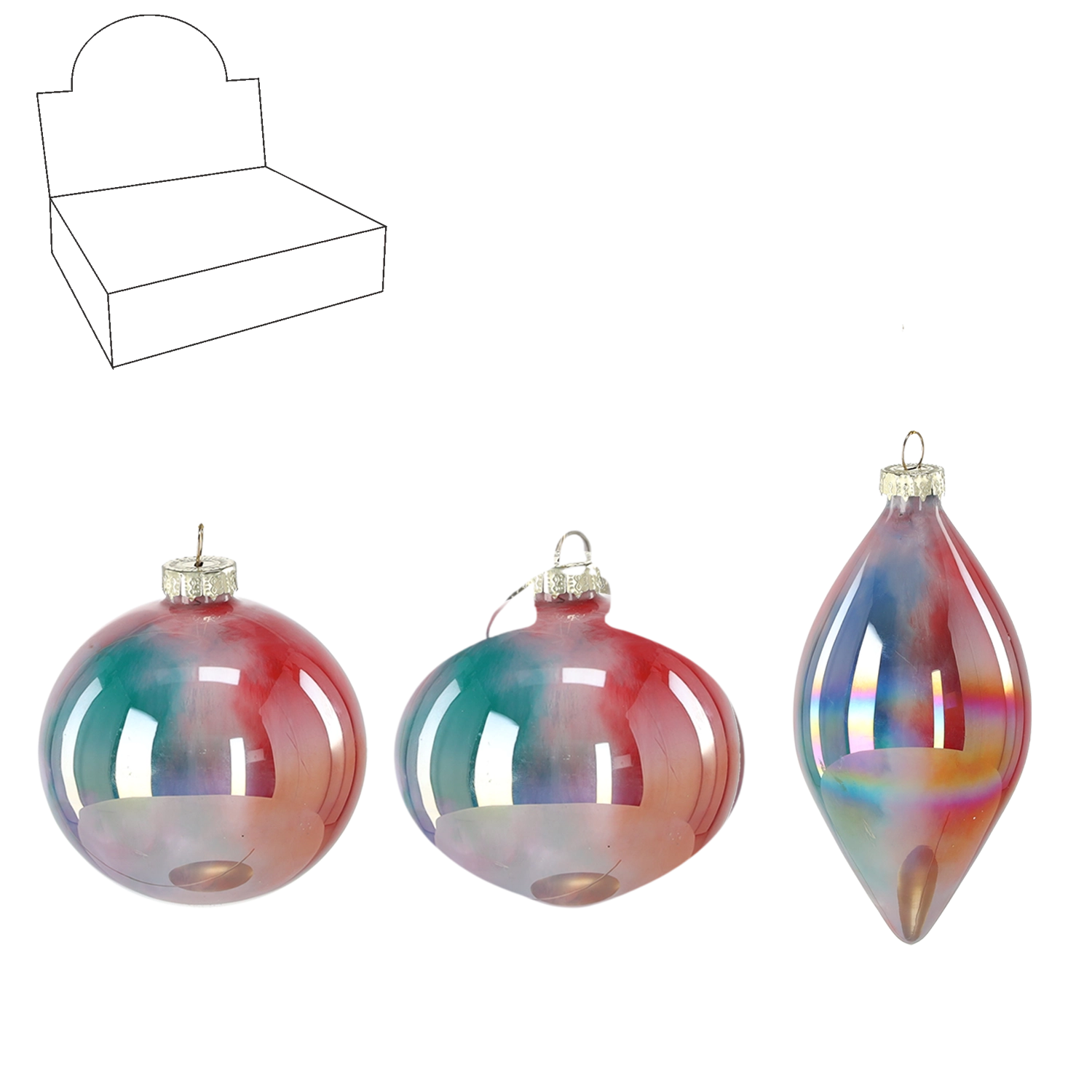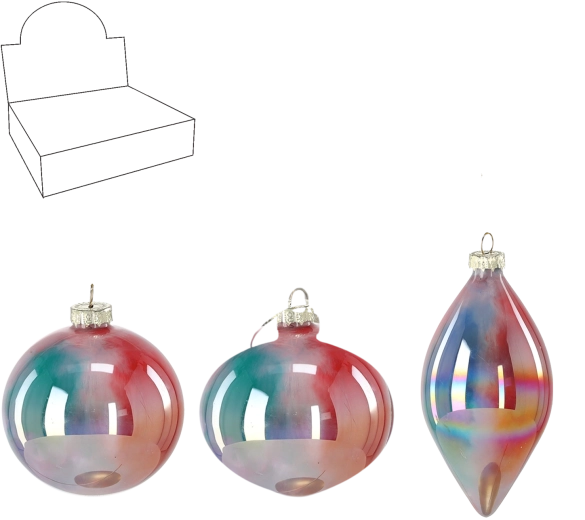 Stwórz świąteczną atmosferę dzięki szklanym ozdobom choinkowym z opalizującą poświatą, które pięknie odbijają światło i podkreślają magię Świąt. Połączenie kształtów okrągłych i podłużnych łatwo dopasujesz do innych dekoracji, uzyskując elegancki, nowoczesny wygląd.