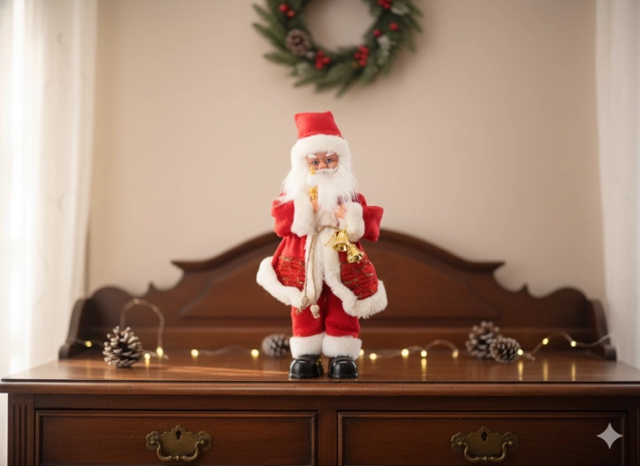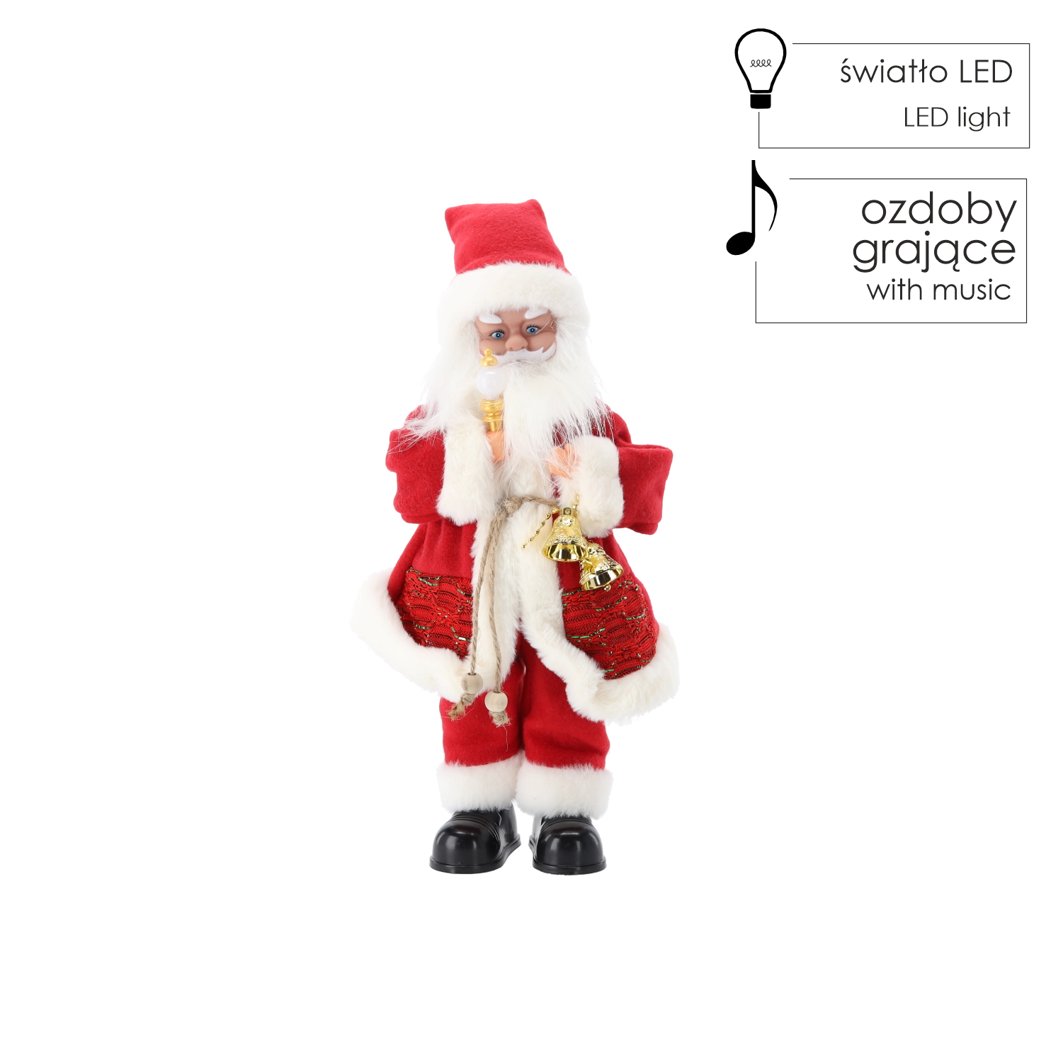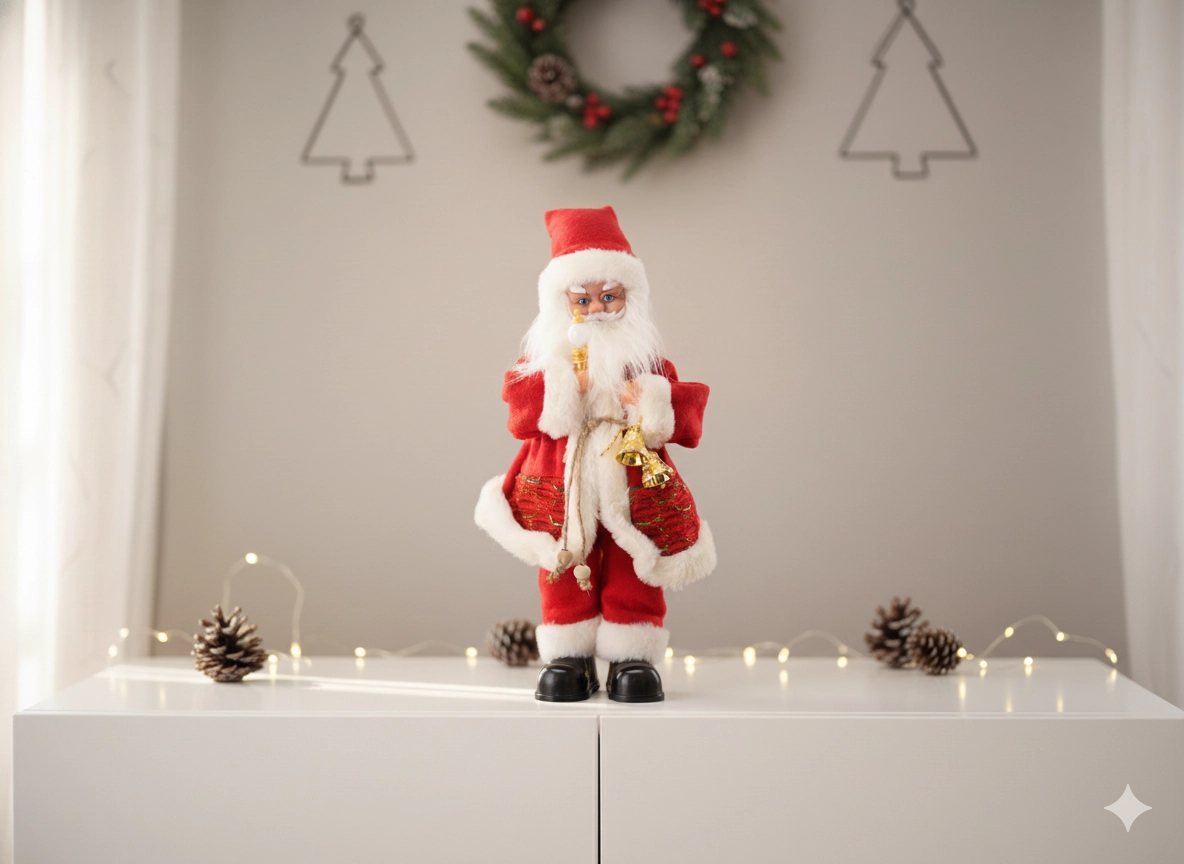 Ta elegancka świąteczna dekoracja łączy tradycyjny motyw MIKOŁAJA z nowoczesnymi elementami – oświetleniem LED i funkcją muzyczną. Bogate detale, miękki kostium i akcesoria, takie jak świeczka czy dzwoneczek, nadają wnętrzu ciepły, świąteczny charakter.