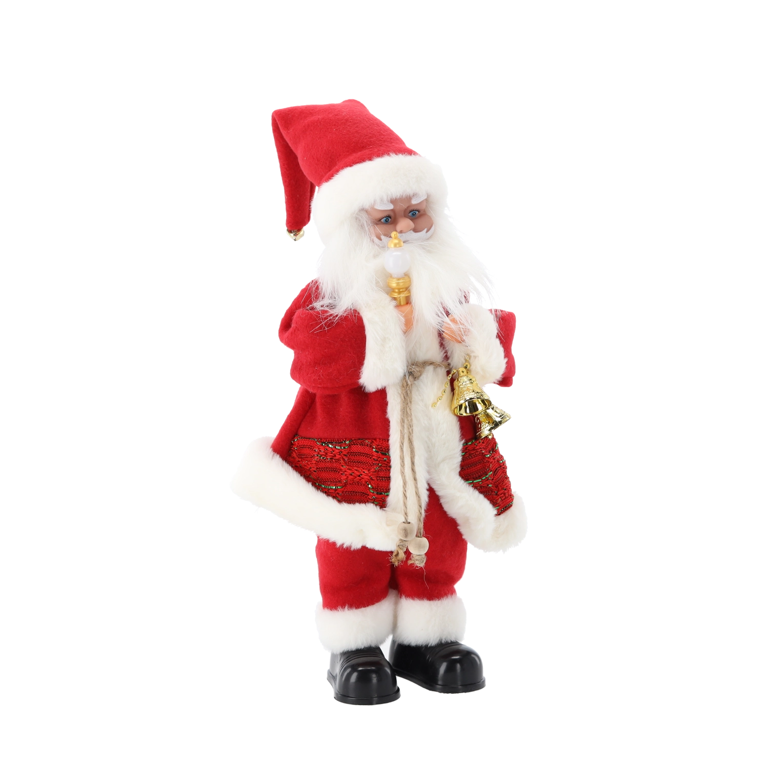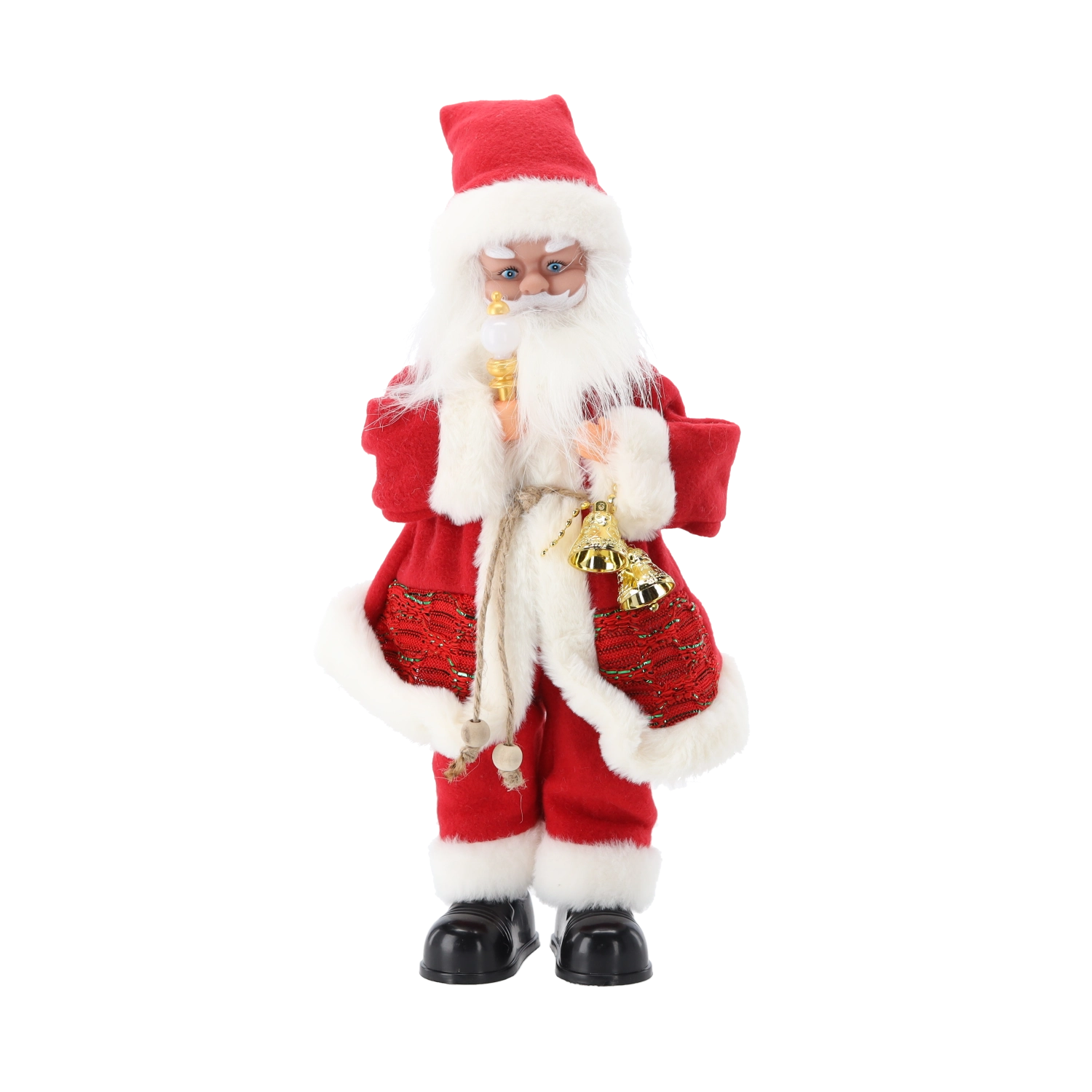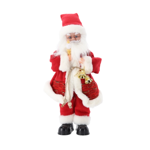 Detale jak bujna broda, kostium z białą lamówką i dodatki. Stabilnie stoi na równej powierzchni – idealna na komodę lub pod choinkę.