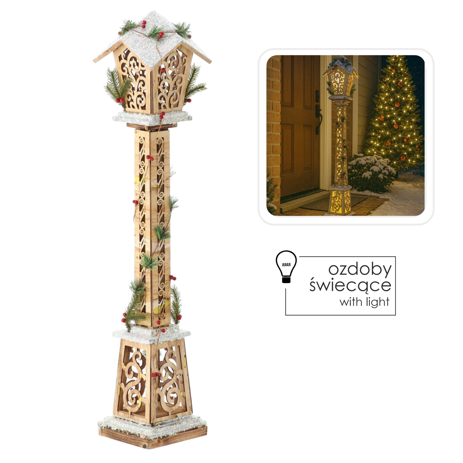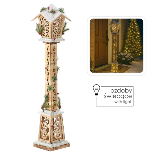 Ta wysoka drewniana latarnia w brązowym odcieniu dzięki zintegrowanym diodom LED emituje przyjemne, ciepłe światło, które pięknie przenika przez dekoracyjne wycięcia. Realistyczne gałązki, jagody i śnieżne detale podkreślają zimowy i świąteczny charakter, dlatego idealnie sprawdzi się przy drzwiach, na werandzie, w salonie czy obok choinki.
