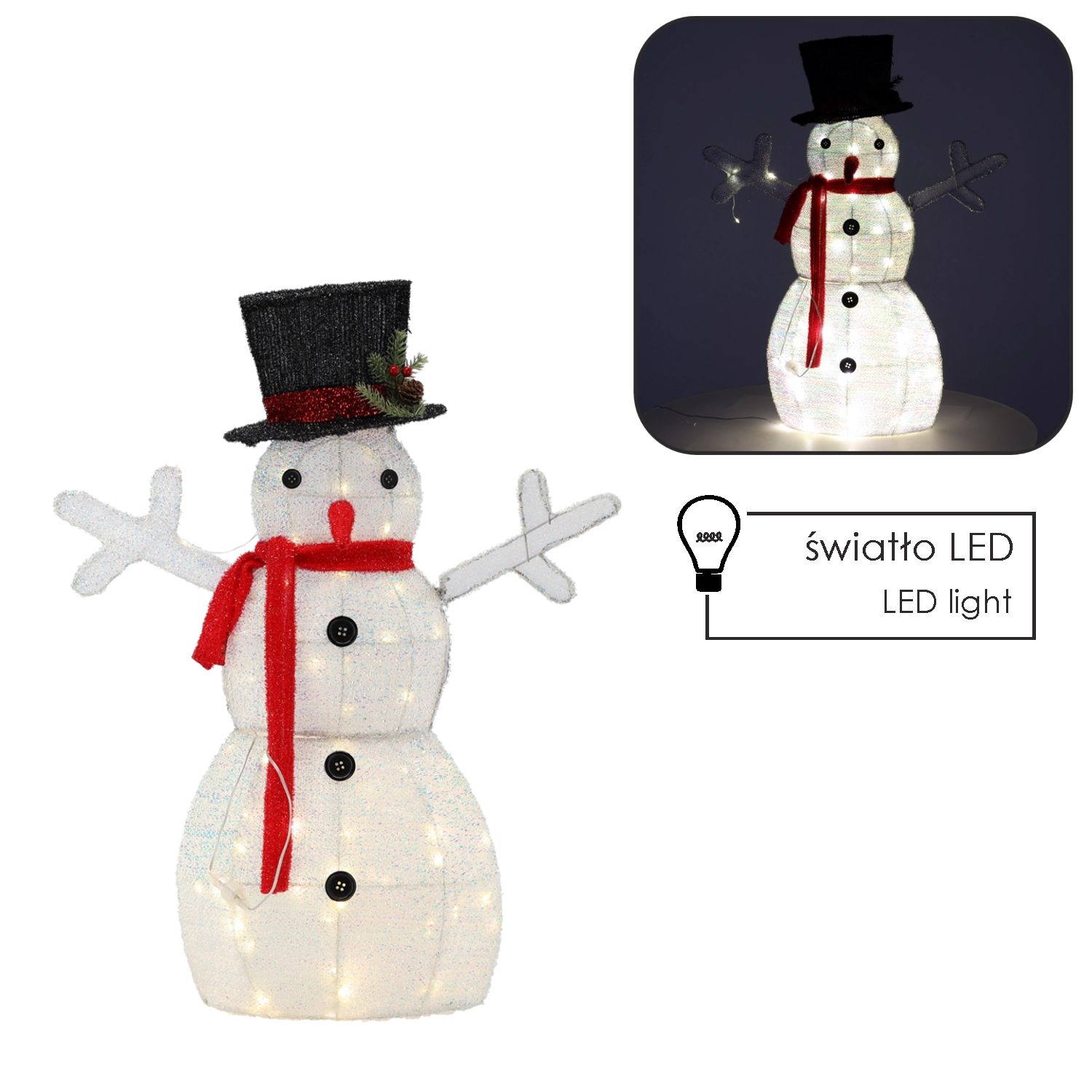 Postaw na klasyczny motyw w nowoczesnym wydaniu. Ten świecący bałwan stanie się centrum Twojej dekoracji – łączy elegancki wygląd, jasne białe oświetlenie LED i niezawodne zasilanie sieciowe. Idealny jako samodzielna ozdoba lub dodatek do choinki czy zimowej scenki.