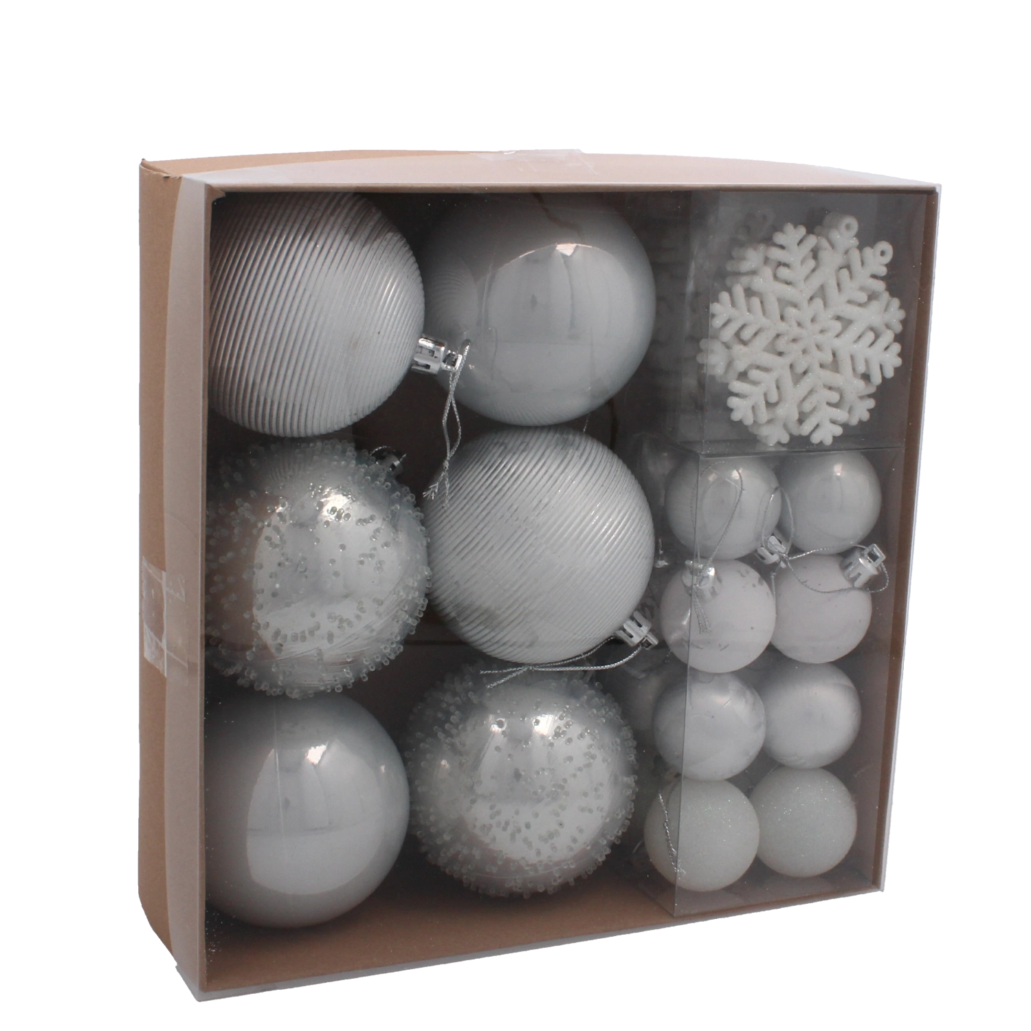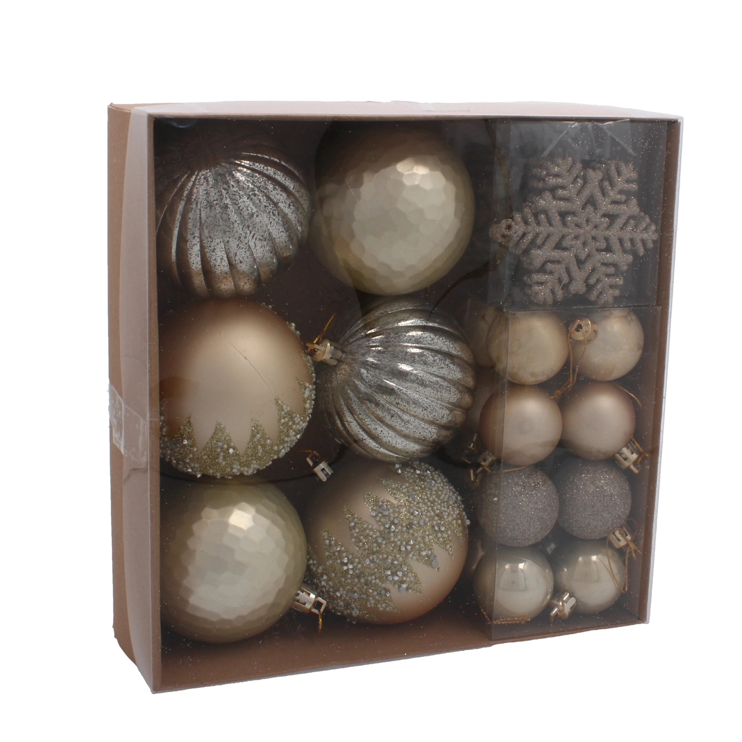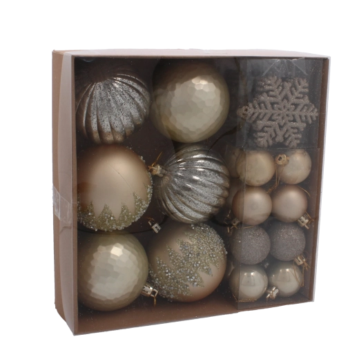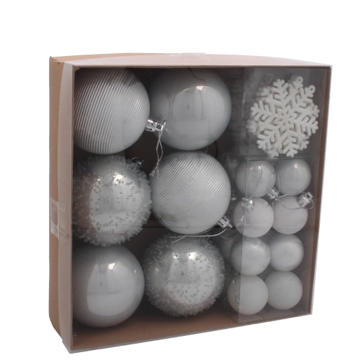 Ta wyważona kolekcja 30 bombek oferuje doskonałe połączenie złotych i srebrnych tonów, które rozświetlą każdą choinkę. Lekki, wytrzymały i nietłukący plastik zapewnia łatwe zawieszanie i bezpieczeństwo w domach z dziećmi oraz zwierzętami. Dzięki miksowi gładkich, błyszczących, brokatowych i reliefowych wykończeń uzyskasz na choince głębię, rytm i świeży, luksusowy efekt.
