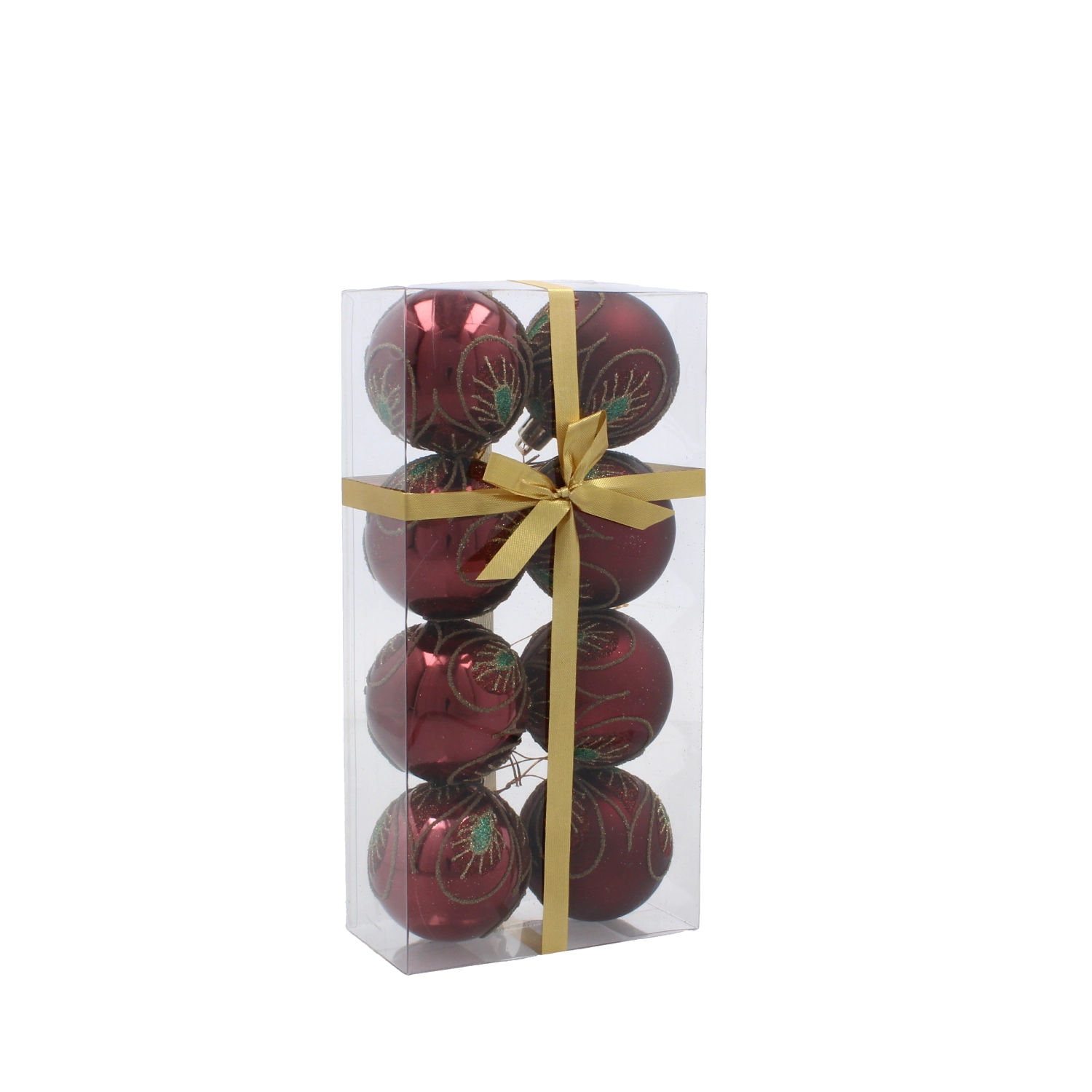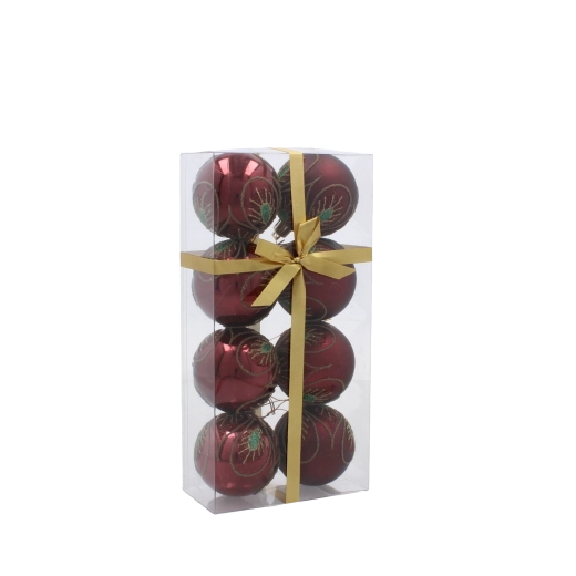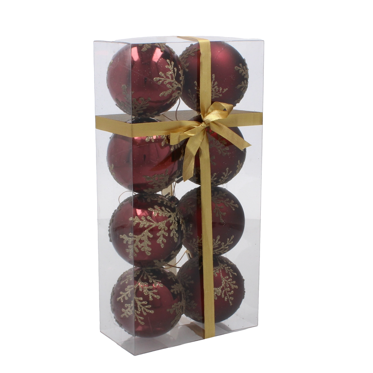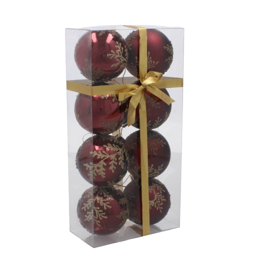 Zestaw bordowych bombek choinkowych 6 cm ze złotym roślinnym wzorem – 8 szt.