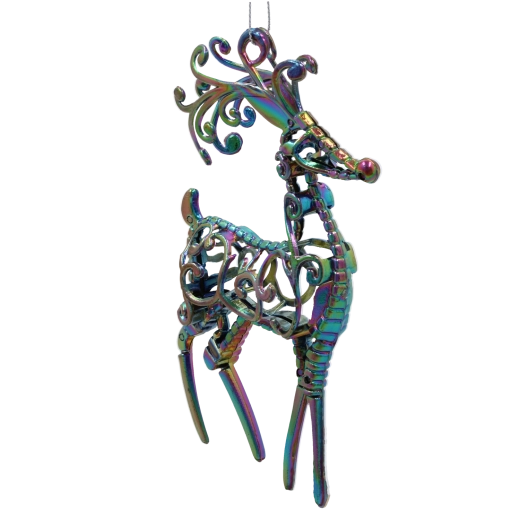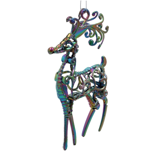 Wnieś do swoich świątecznych dekoracji odrobinę szyku dzięki ozdobie w kształcie jelenia z efektem olejowej tęczy. Specjalna powierzchnia tworzy przy padaniu światła zmienne kolorowe refleksy, które podkreślą piękno choinki i świątecznych aranżacji.