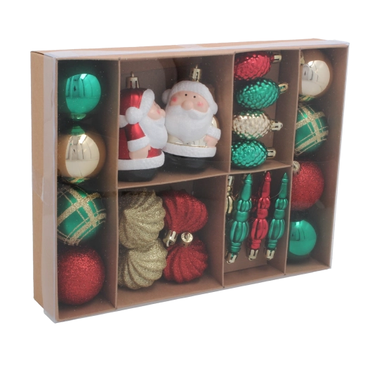 Rozświetl swoją choinkę stylowym zestawem 24 ozdób świątecznych w klasycznych kolorach: czerwonym, zielonym i złotym. Lekki i wytrzymały plastik gwarantuje bezpieczne użytkowanie oraz długą żywotność, a połyskujące detale i różne kształty, takie jak bombki, szyszki czy szpice, nadają dekoracji elegancki, świąteczny wygląd. Każdy element ma sznureczek do zawieszania, co ułatwia umieszczanie na gałązkach.