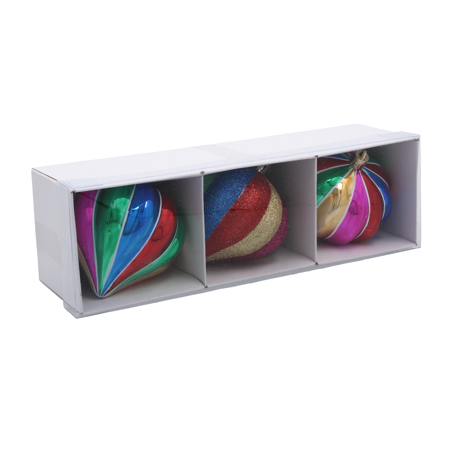 Ozdoby są estetycznie pakowane po trzy sztuki, co ułatwia przechowywanie, podarowanie w prezencie i uzyskanie spójnego wyglądu dekoracji.