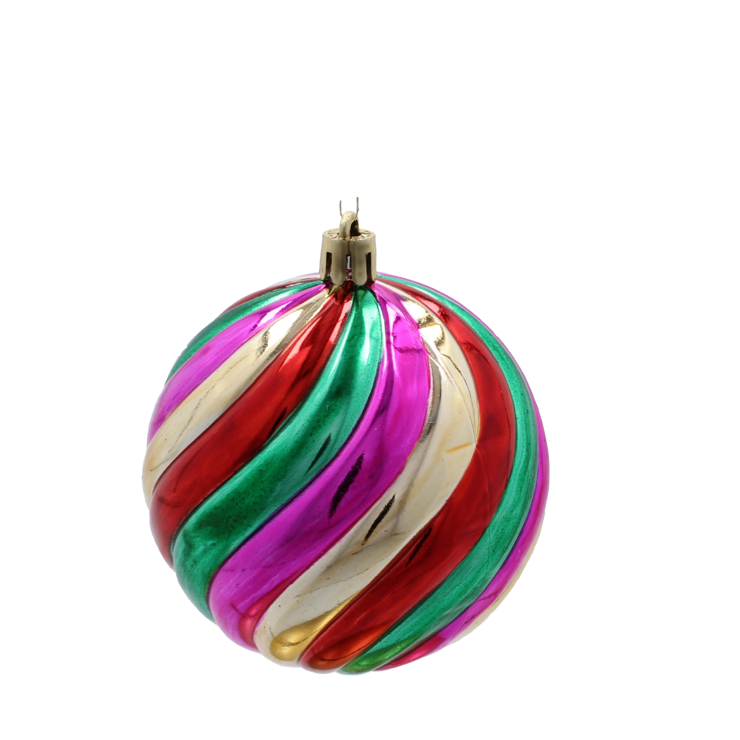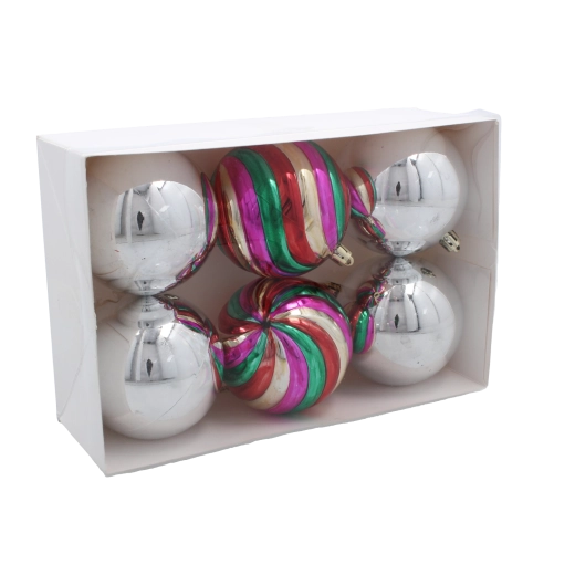 Ten designerski zestaw 6 bombek o średnicy 8 cm łączy ponadczasową srebrną elegancję z zabawnymi prążkowanymi ornamentami w kolorach różowym, zielonym, czerwonym i złotym. Błyszcząca powierzchnia pięknie odbija światło, tworząc świąteczną atmosferę o premium charakterze.