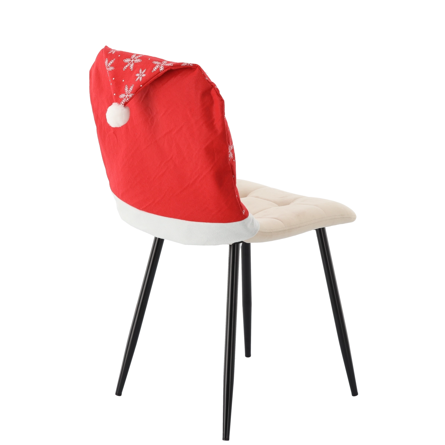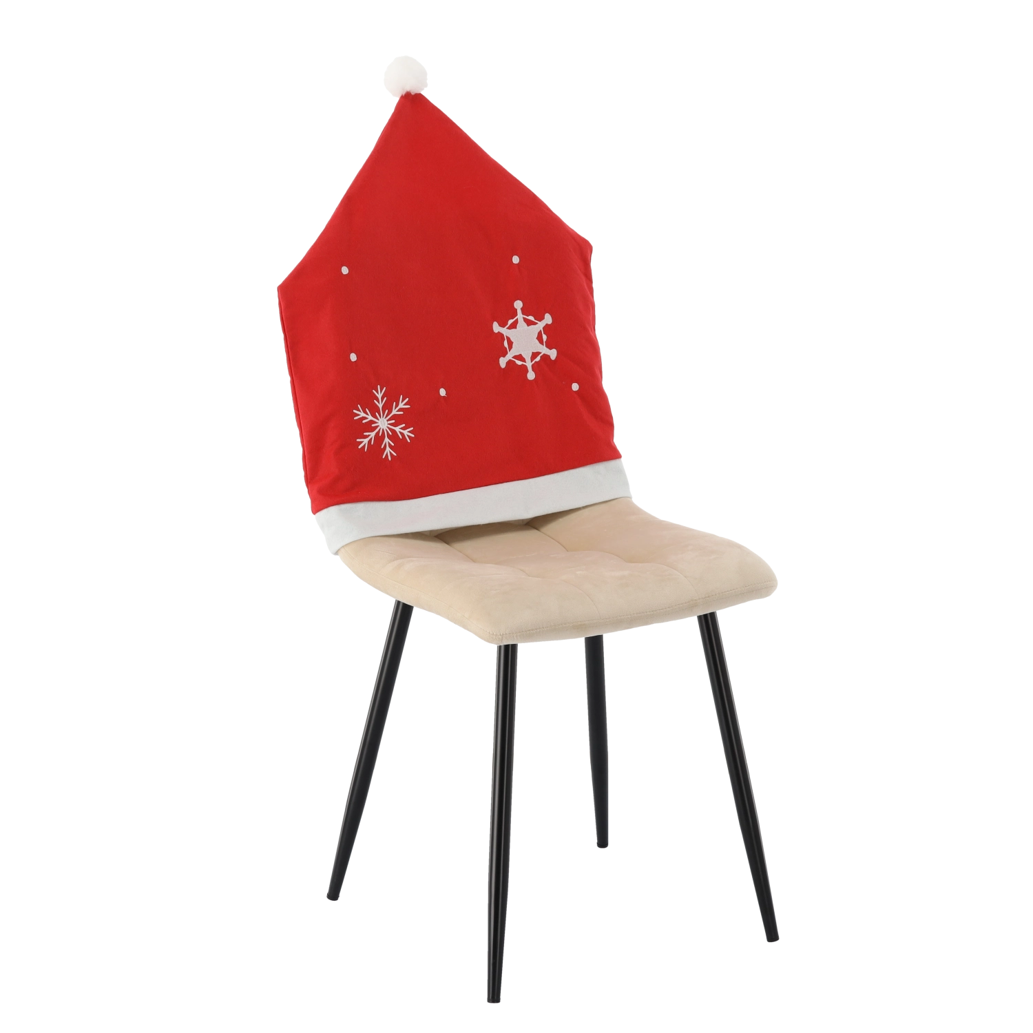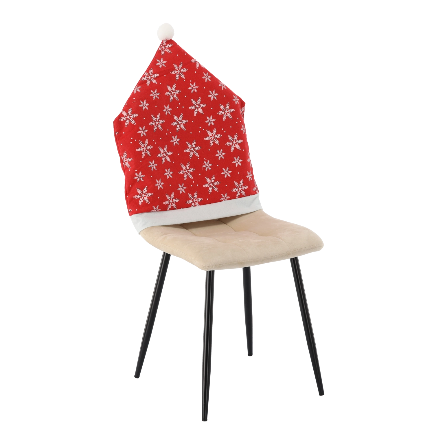 Czerwony pokrowiec z białą lamówką, pomponem i motywem śnieżynek nada krzesłom czarujący, świąteczny wygląd w kilka sekund.