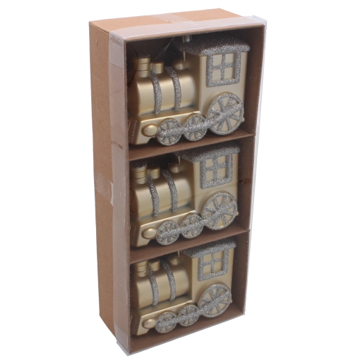 Stwórz doskonałą, świąteczną atmosferę dzięki eleganckiemu zestawowi trzech bożonarodzeniowych ozdób w kształcie lokomotywy. Złote wykończenie z delikatnym brokatem nadaje dekoracjom luksusowy wygląd i podkreśla magię zimowych świąt. Dzięki lekkiemu i trwałemu plastikowi są odpowiednie także dla rodzin z dziećmi, zachowując długą żywotność.
