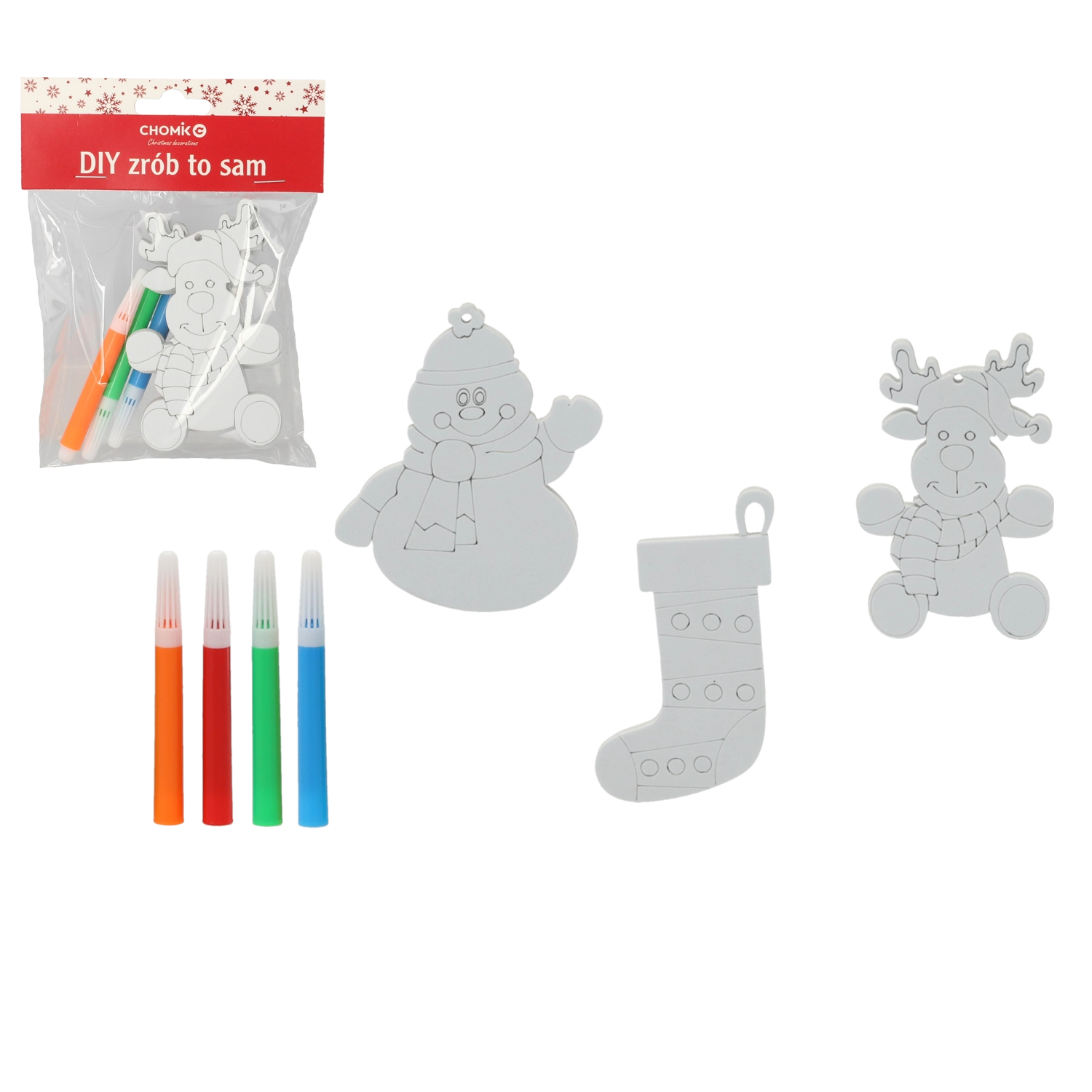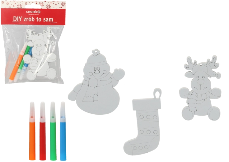 - 3 wiszące ozdoby (bałwanek, renifer, skarpeta) + 4 kolorowe markery