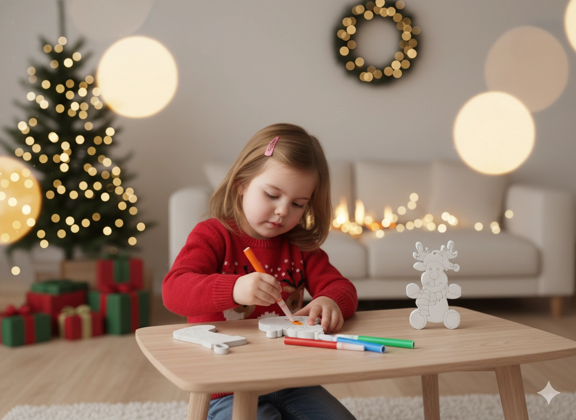 Stwórz własną świąteczną magię! Ten kreatywny zestaw zawiera 3 wiszące ozdoby do kolorowania – bałwanka, renifera i skarpetę – oraz 4 kolorowe markery. Lekki materiał jest idealny dla dzieci, łatwo się dekoruje, a gotowe ozdoby wystarczy zawiesić na choince, w oknie lub na prezencie. Świetna zabawa dla całej rodziny i piękna świąteczna dekoracja DIY.