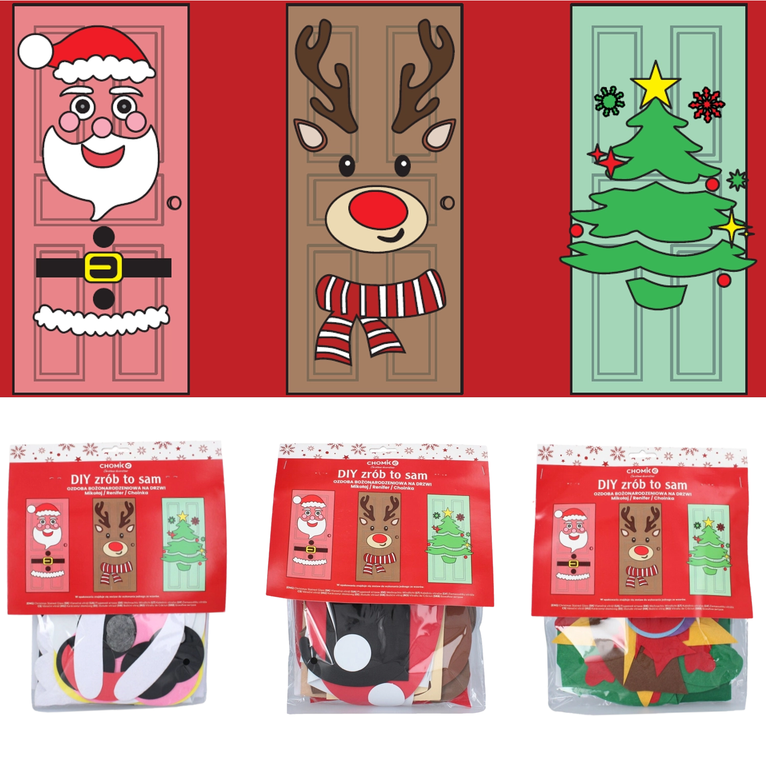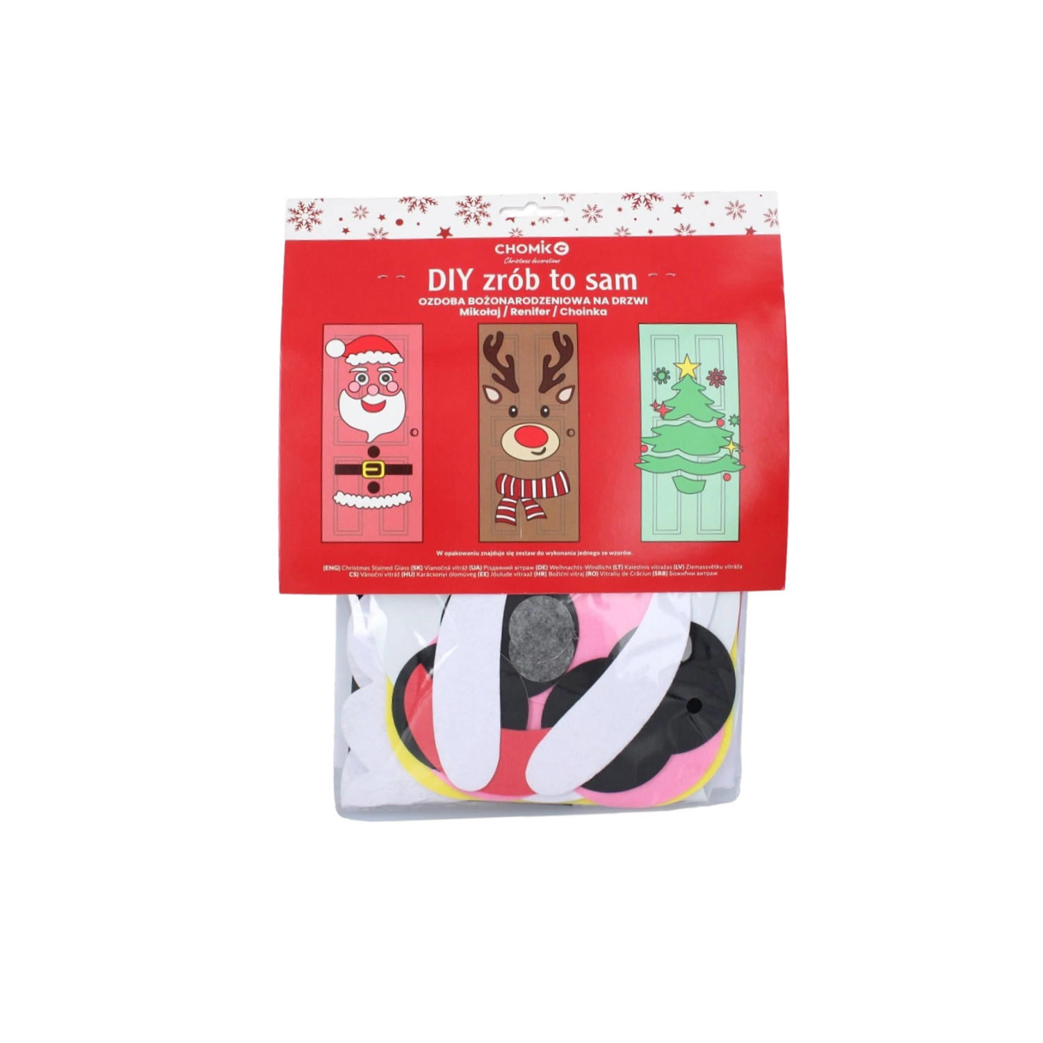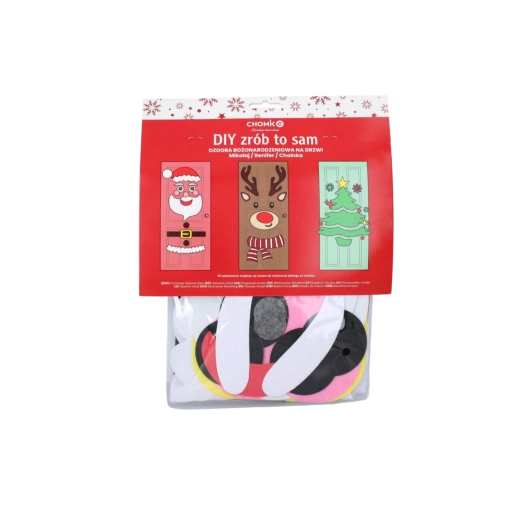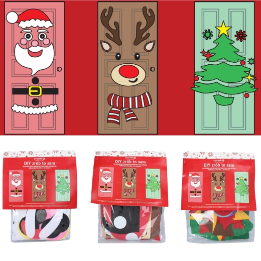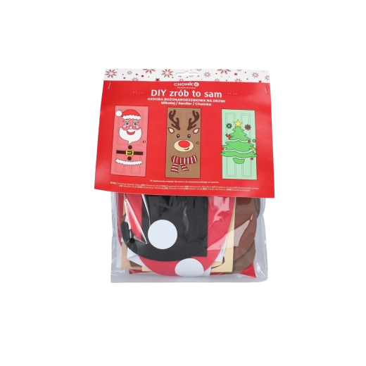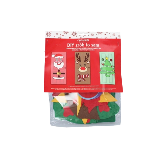 Ta świąteczna dekoracja zamieni każde drzwi wewnętrzne lub wejściowe w efektowny bożonarodzeniowy akcent. Miękkie filcowe i samoprzylepne elementy łatwo przymocujesz i w każdej chwili przearanżujesz – idealne dla dzieci i dorosłych. Wybierz motyw choinki, MIKOŁAJA lub renifera i stwórz oryginalną ozdobę dokładnie po swojemu.