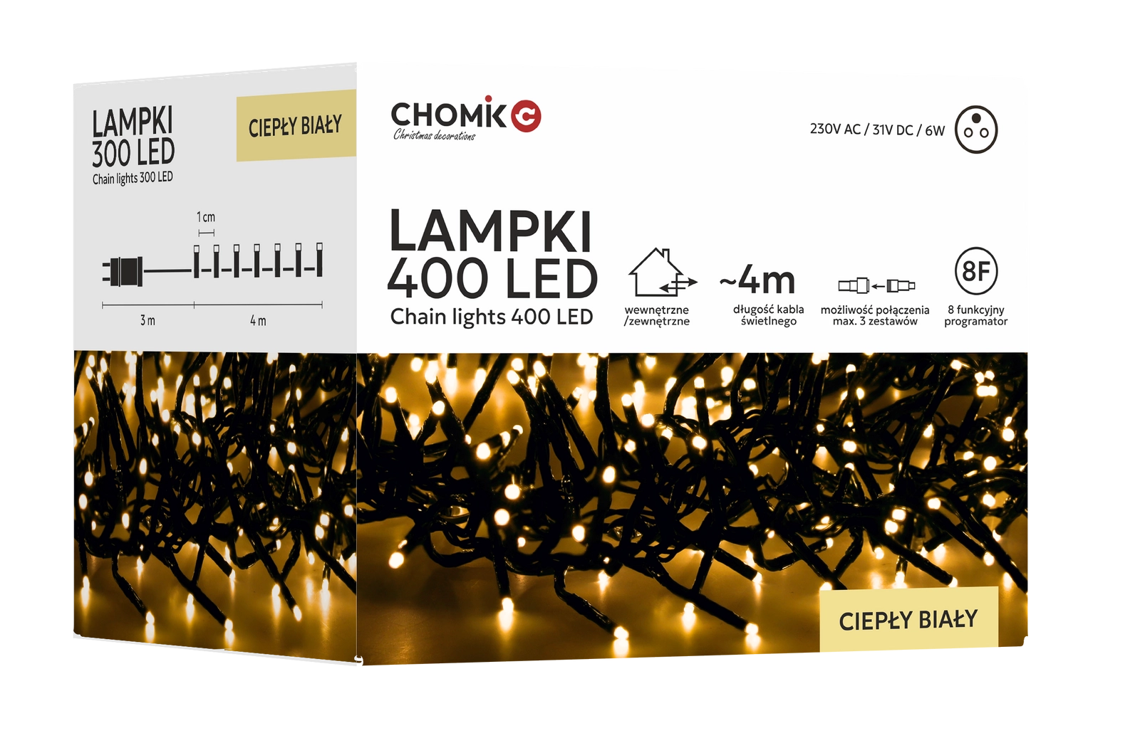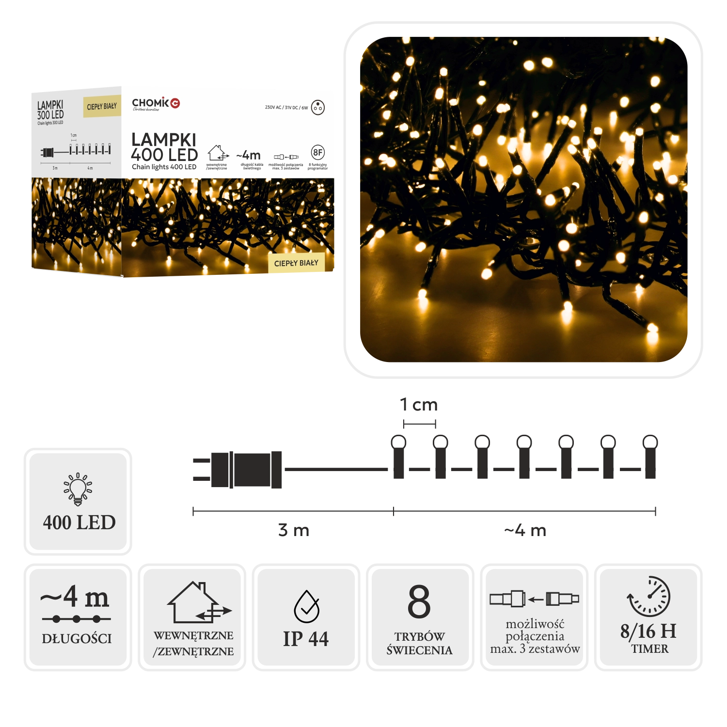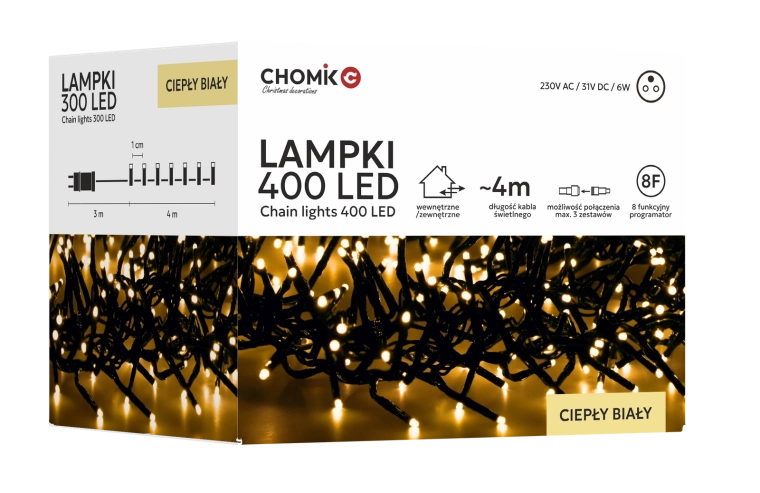 Łańcuch LED Cluster z 400 diodami zapewnia efektowne, gęste światło, które świetnie prezentuje się na choince, balustradzie, ścianie czy w ogrodzie. Ciepła biel tworzy przytulny klimat, a dzięki sterownikowi z pamięcią i timerem łatwo ustawisz ulubiony tryb bez konieczności ponownego programowania.