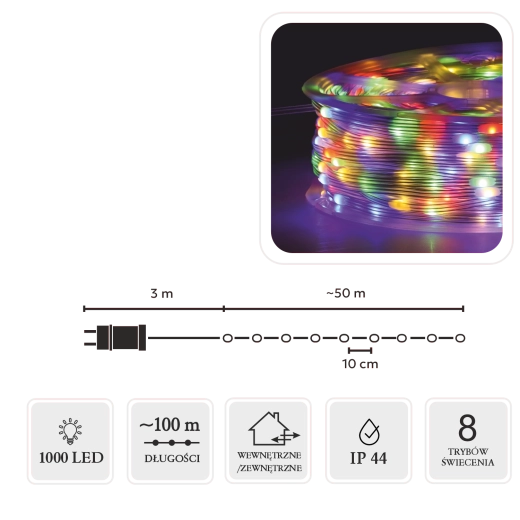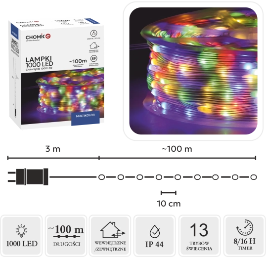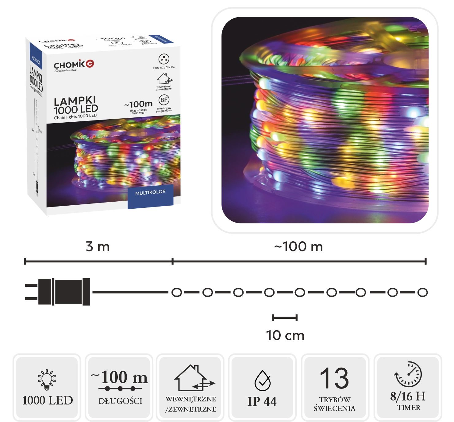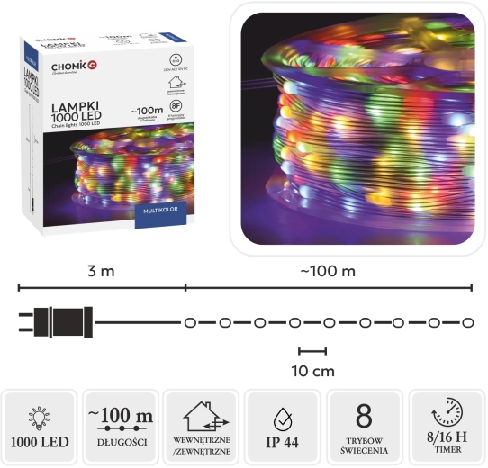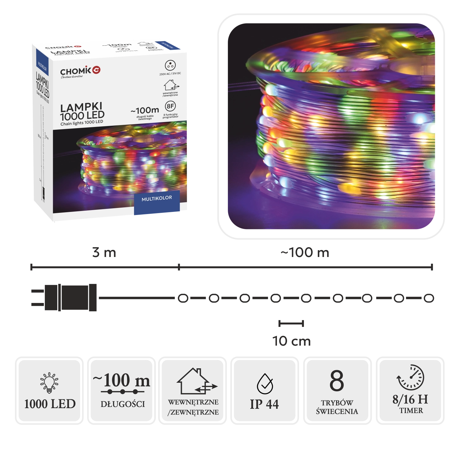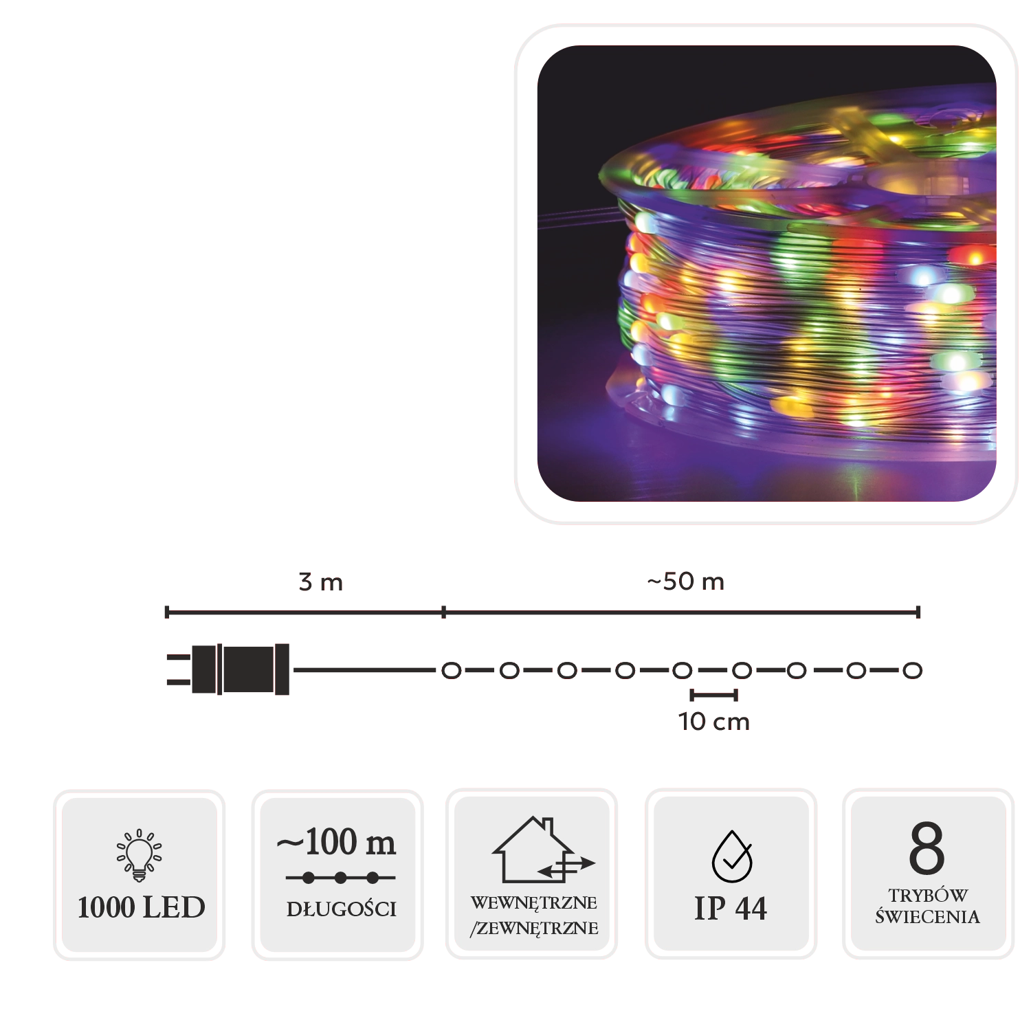Rozświetl dom i ogród ekstra długim łańcuchem LED o długości 100 m z 1000 mikro diodami w wersji multicolor. Dzięki przezroczystemu przewodowi zyskasz czyste światło, a 8 trybów z pamięcią oraz timerem 8/16 h zapewnia wygodne sterowanie. W zestawie znajduje się szpula do łatwego odwijania i przechowywania; produkt nadaje się do wnętrz i na zewnątrz (IP44).