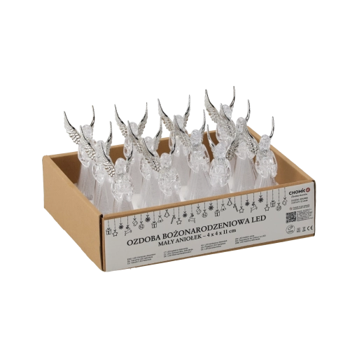 Zasilanie za pomocą 3× LR44 jest już w zestawie, więc dekorację możesz rozświetlić od razu. Obsługa jest intuicyjna dzięki dolnemu przesuwnemu wyłącznikowi ON/OFF. Wysoka jakość wykonania oraz certyfikaty CE i RoHS gwarantują bezpieczne użytkowanie wewnątrz pomieszczeń. Dostępne są różne motywy aniołka (złożone dłonie, serce, prezent, gołębica), które świetnie się ze sobą komponują.