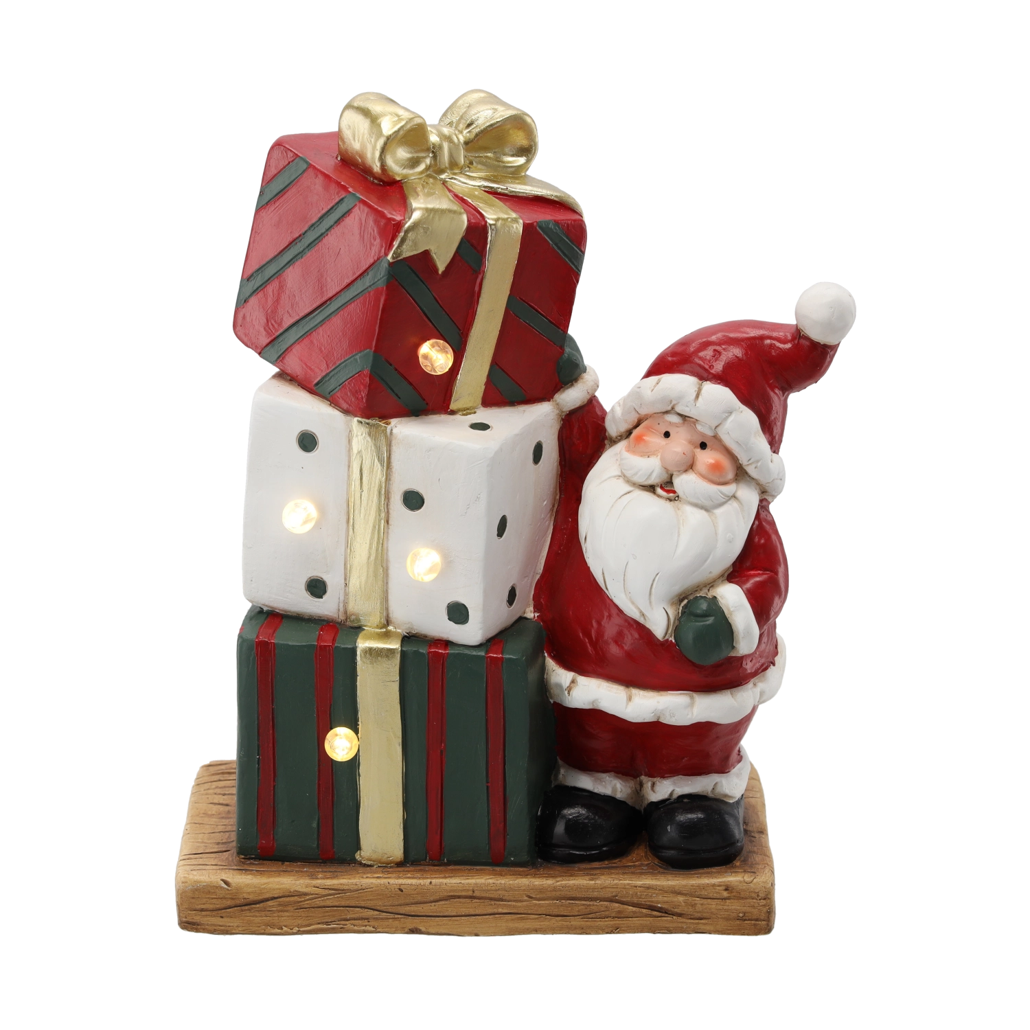 Rozgrzej świąteczną atmosferę elegancką dekoracją – świąteczną figurką Mikołaja z prezentami i oświetleniem LED. Realistyczne detale, ciepłe światło i uniwersalne wymiary sprawdzą się na komodzie, kominku czy parapecie okiennym. Figurka jest zasilana przez 3× baterie AAA (brak w zestawie), więc możesz ją ustawić gdziekolwiek bez kabli.
