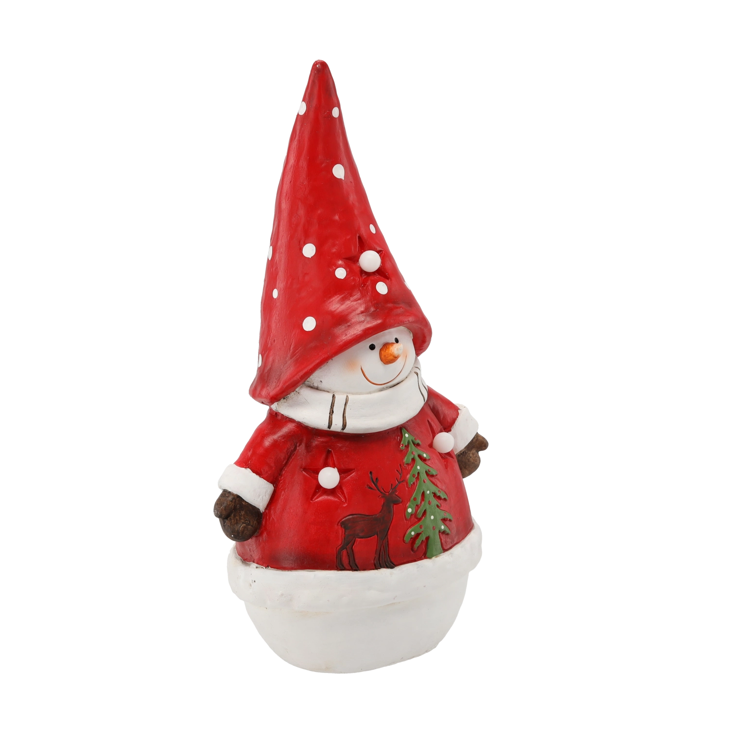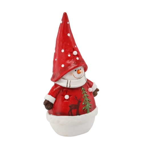 Bałwanek w czerwonej czapce i płaszczyku w białe kropki z motywem jelenia i choinki. Błyszczące wykończenie podkreśla świąteczny urok.