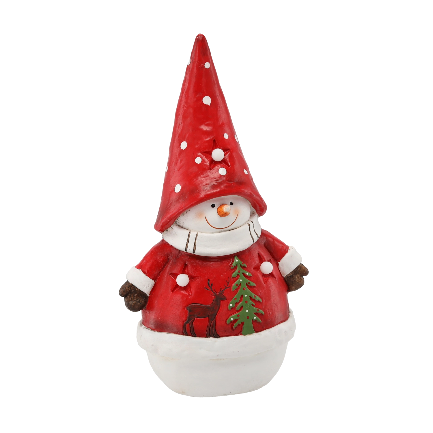 Ta świąteczna figurka bałwanka w czerwonej czapce i płaszczyku w białe kropki to wyrazisty element świątecznej dekoracji. Dzięki zintegrowanemu oświetleniu LED subtelnie rozbłyśnie i stworzy przyjemną, zimową atmosferę w każdym pomieszczeniu. Wysokiej jakości materiał z ceramiki magnezjowej zapewnia stabilność i długą trwałość.