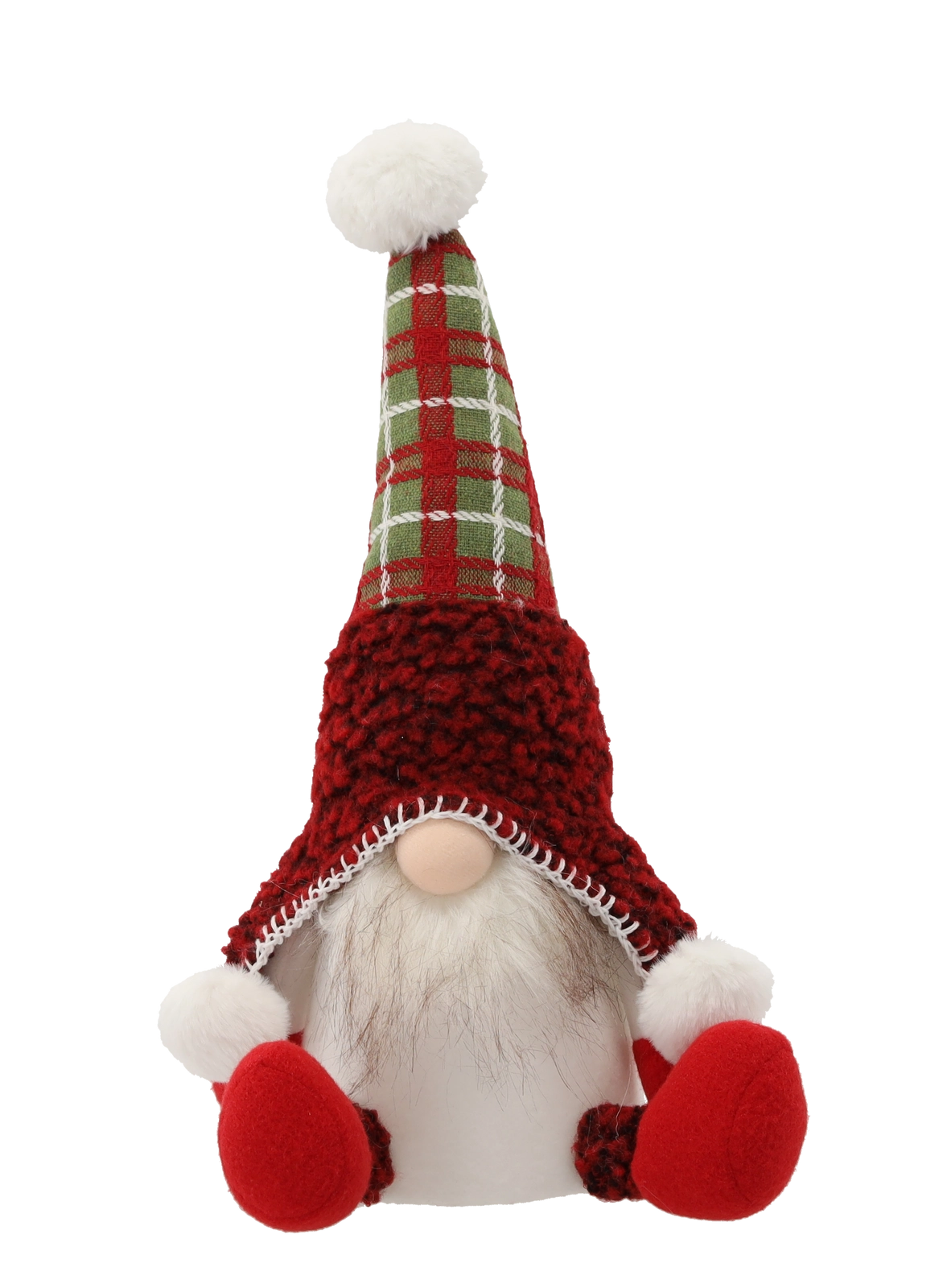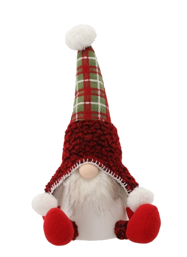 Kraciasta czapka, puszysta broda i miękkie materiały nadają dekoracji ponadczasowy wygląd. Doskonale pasuje na półki, komody oraz gzymsy kominkowe.