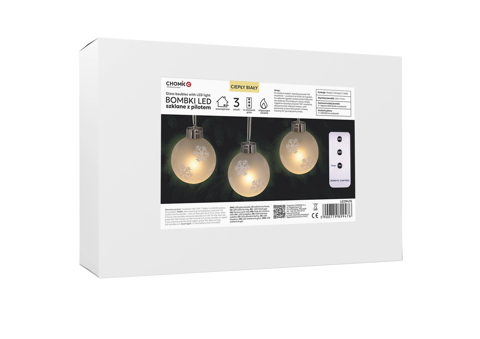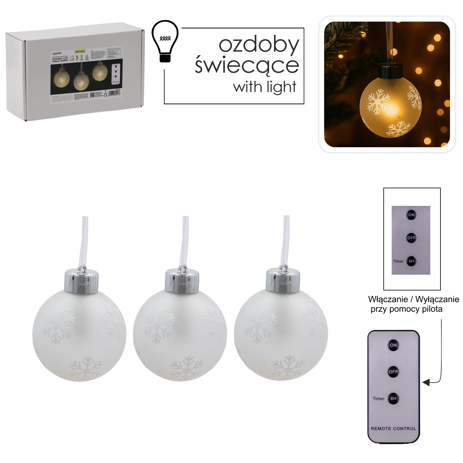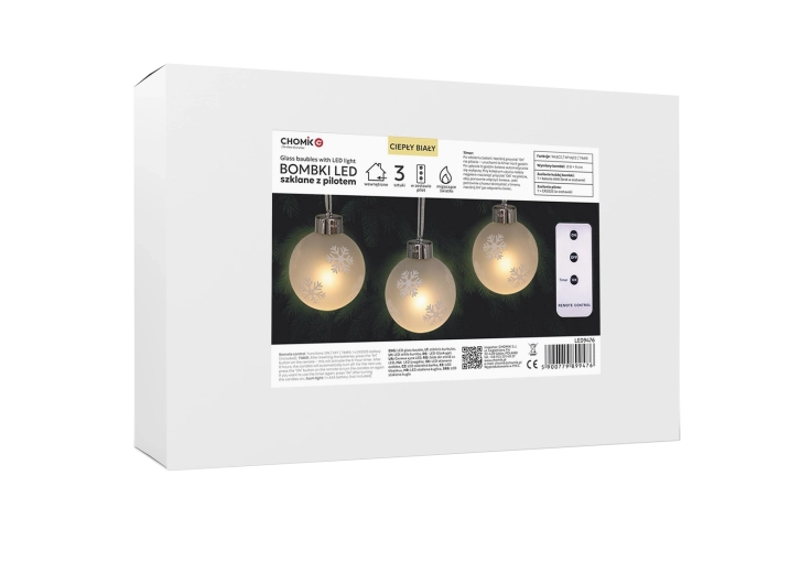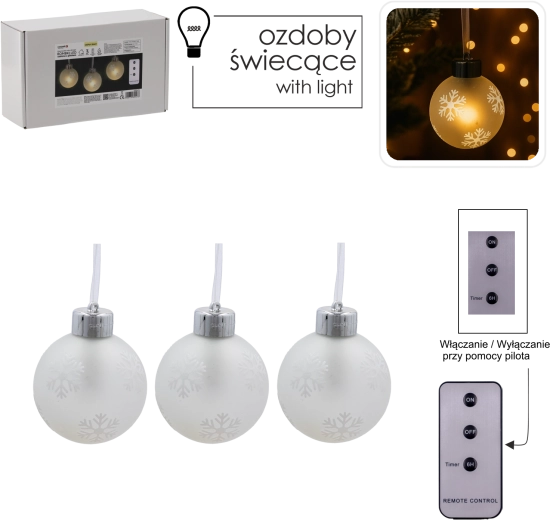 Stwórz w domu magiczną, świąteczną atmosferę dzięki zestawowi trzech szklanych bombek z delikatnym wzorem śnieżyniek i ciepłym światłem LED. Dzięki pilotowi z timerem i zasilaniu bateryjnemu dekoracja jest łatwa w obsłudze, bezpieczna i gotowa do użycia od razu w dowolnym miejscu – na choince, półce czy stole.