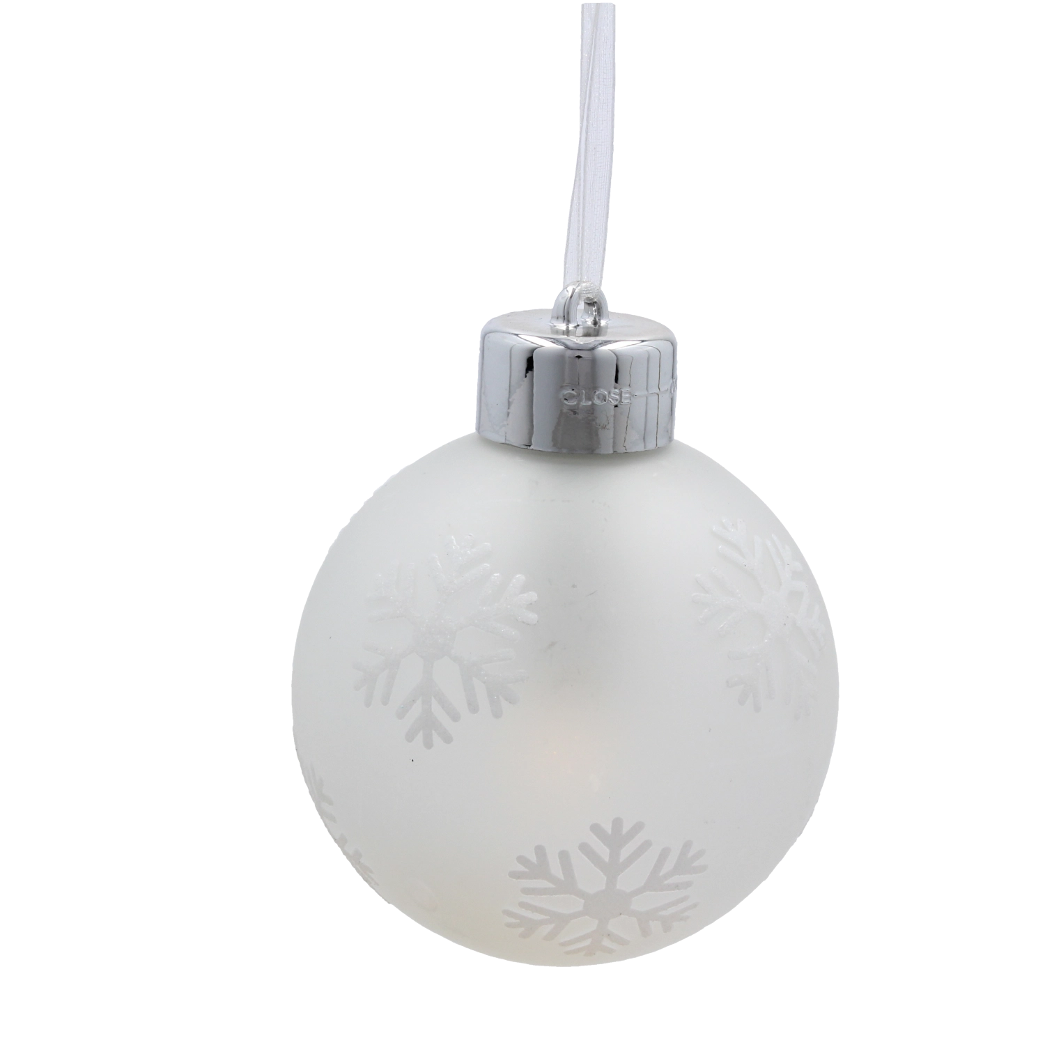 Eleganckie szklane kule o matowej powierzchni i wzorze śnieżynek rozświetlą Twoją choinkę i wnętrze przyjemnym, ciepłym blaskiem. Zintegrowane diody LED tworzą przytulne światło z delikatnym połyskiem, które podkreśli świąteczną aranżację bez kłopotów z kablami.