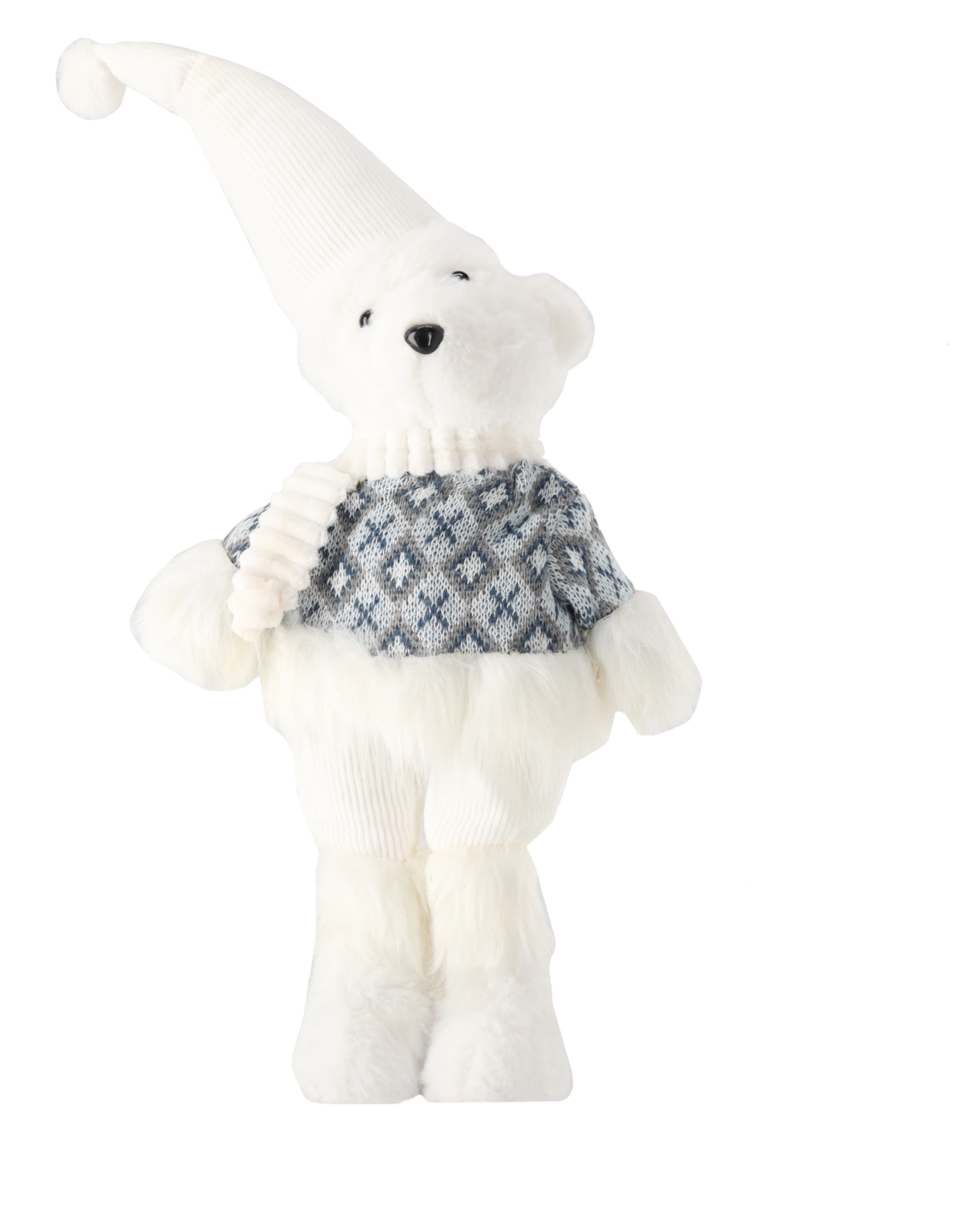 Miś zachwyca mięciutką powierzchnią, długą spiczastą czapką i wzorzystym swetrem. Bezpiecznie wyszywane detale dodają mu uroku i przytulności.