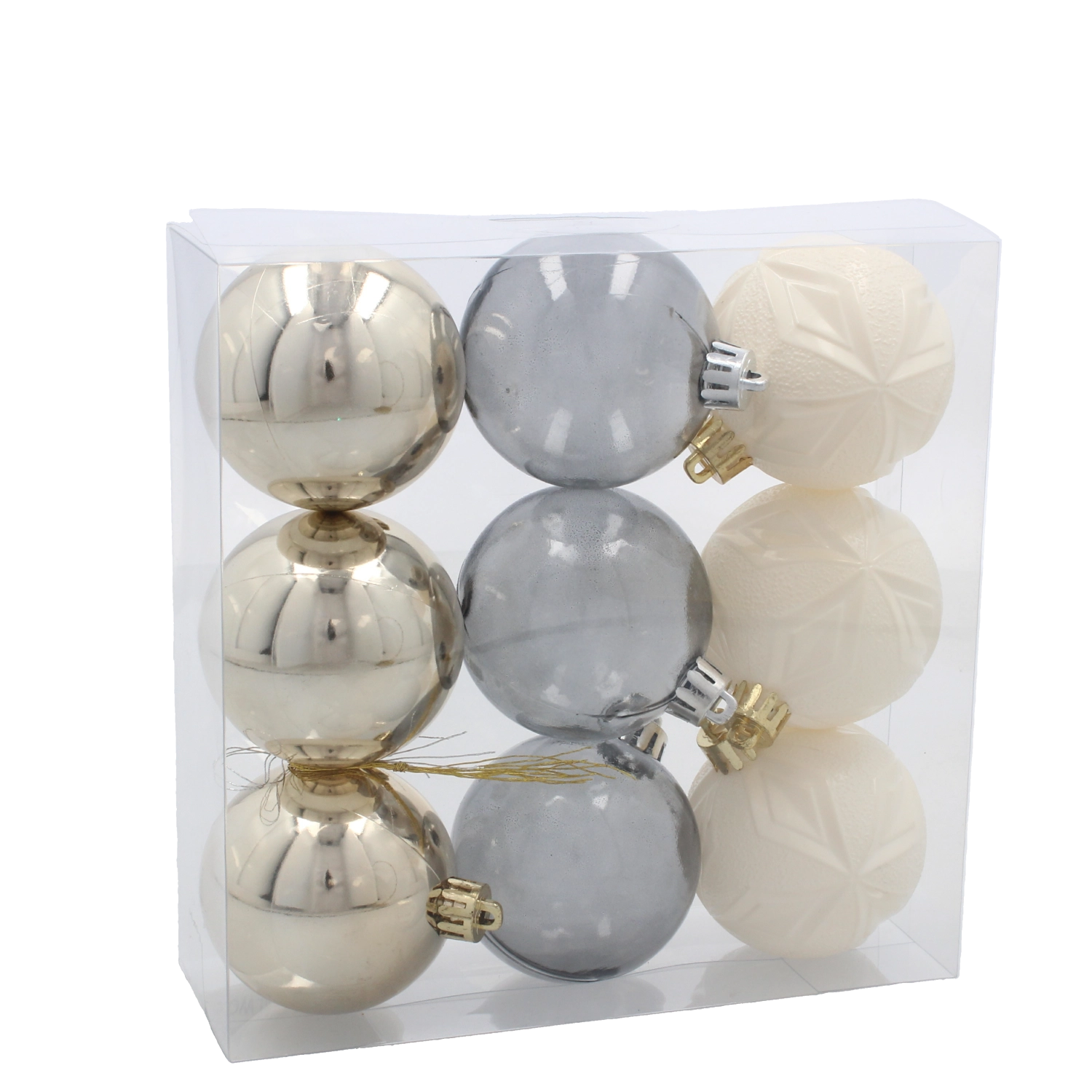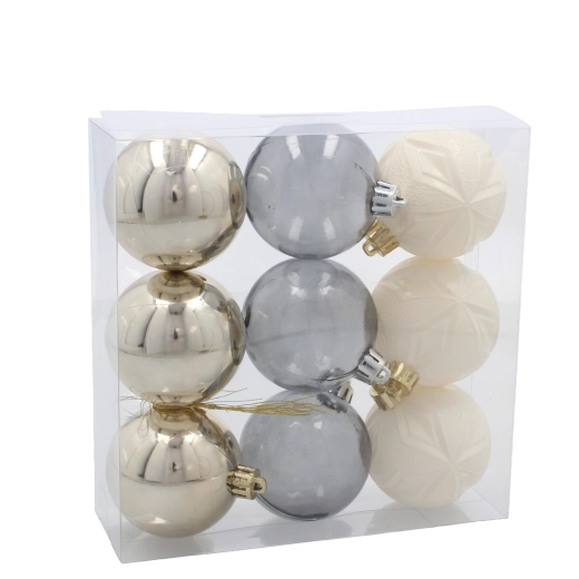 Ten stylowy zestaw zawiera 9 starannie wykonanych ozdób, które łączą trzy nowoczesne odcienie i różne wykończenia, tworząc zrównoważoną świąteczną dekorację. Dzięki wytrzymałemu plastikowi bombki są lekkie, bezpieczne i łatwe do zawieszenia na każdym rodzaju choinki.