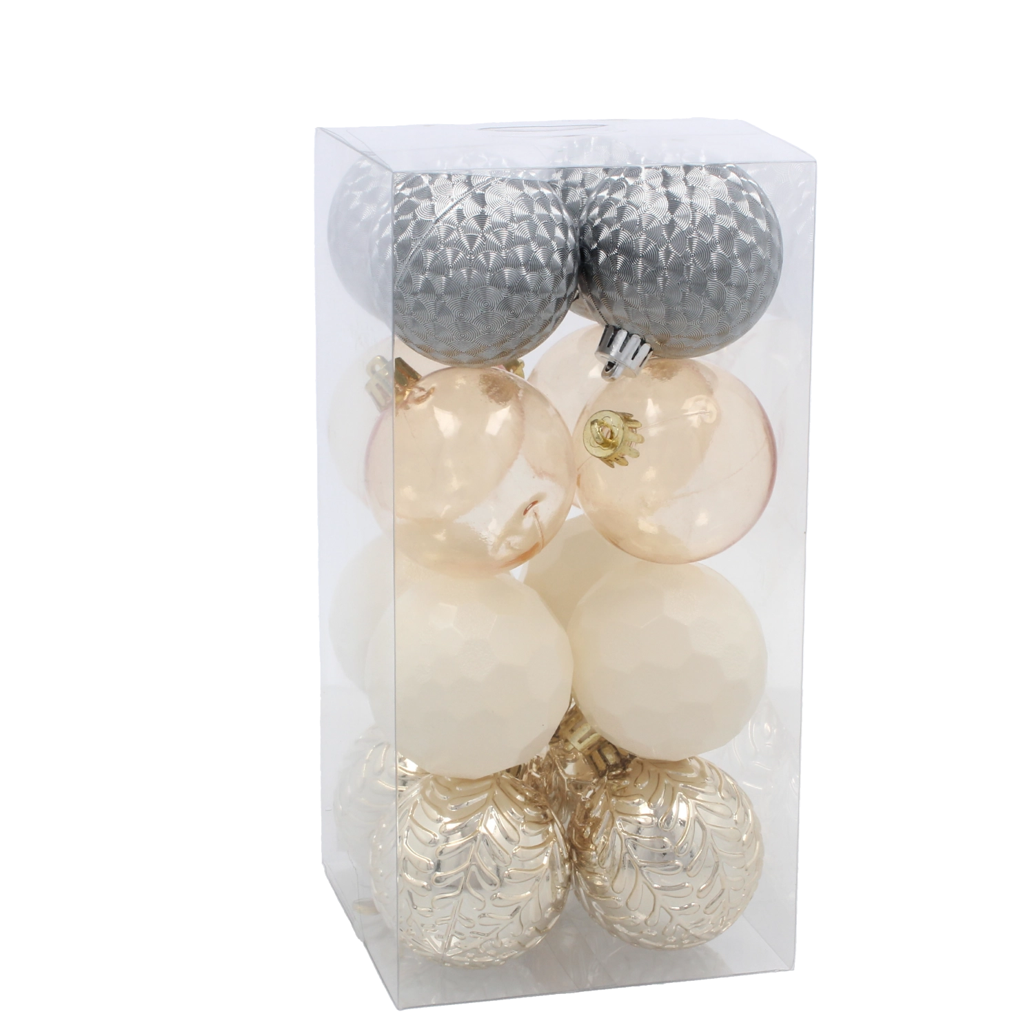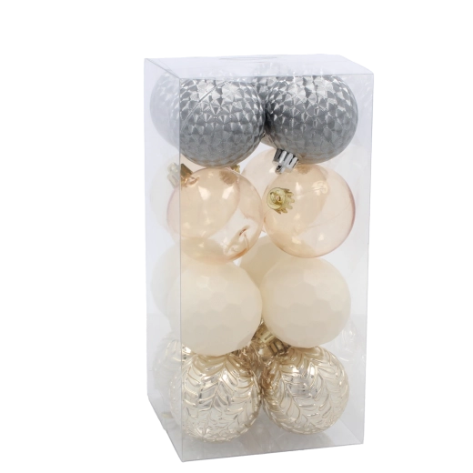 Stwórz perfekcyjnie skomponowaną świąteczną aranżację z zestawem 16 ozdób CHOMIK w ponadczasowych tonach szampańskim, szarym i białym. Połączenie gładkich i zdobionych powierzchni nadaje choince i dekoracjom luksusowy i nowoczesny charakter, który świetnie wpisuje się w tradycyjne i współczesne wnętrza.
