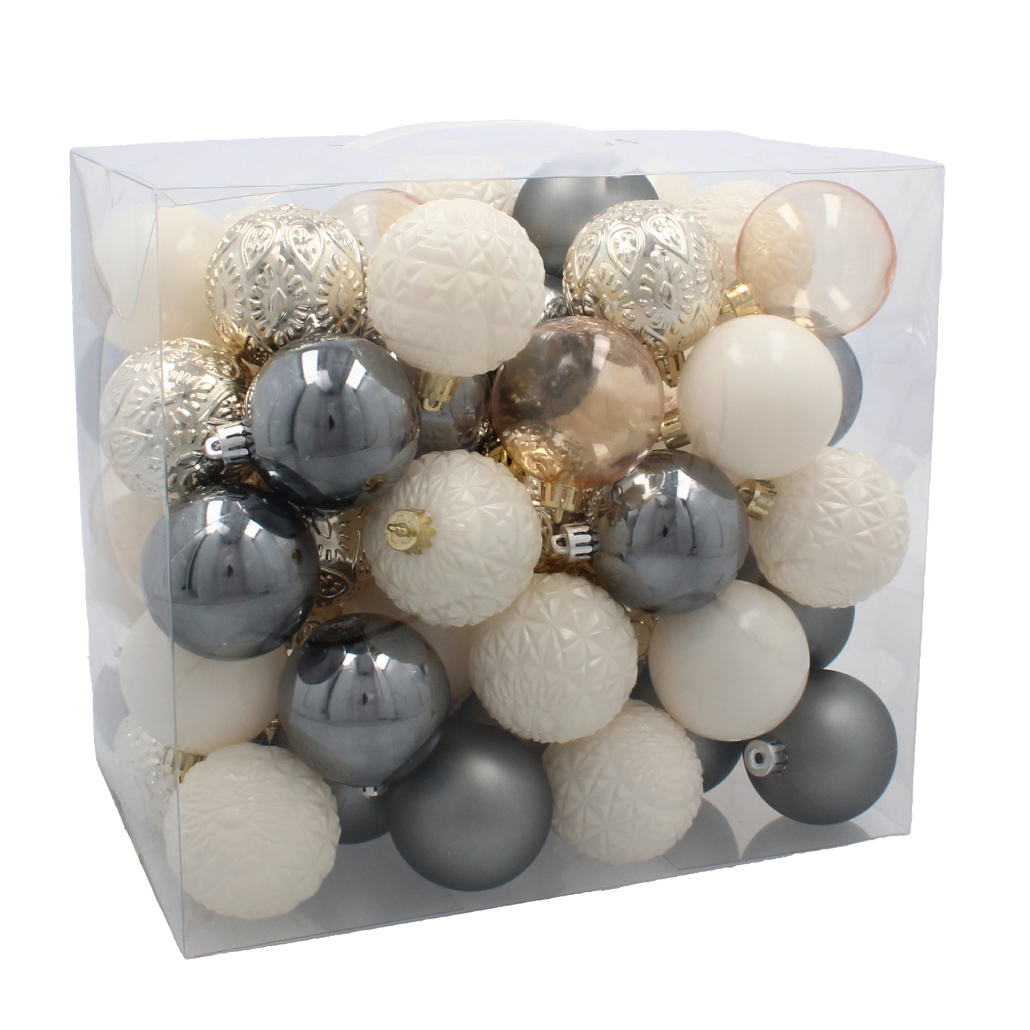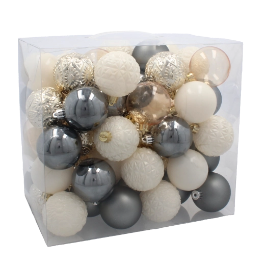 Ten uniwersalny zestaw bombek świetnie komponuje się z tradycyjnymi i nowoczesnymi dekoracjami. Neutralna paleta szampańskiego, szarego i białego tworzy wyrafinowaną atmosferę, która podkreśla magię Świąt bez zbędnego przepychu.