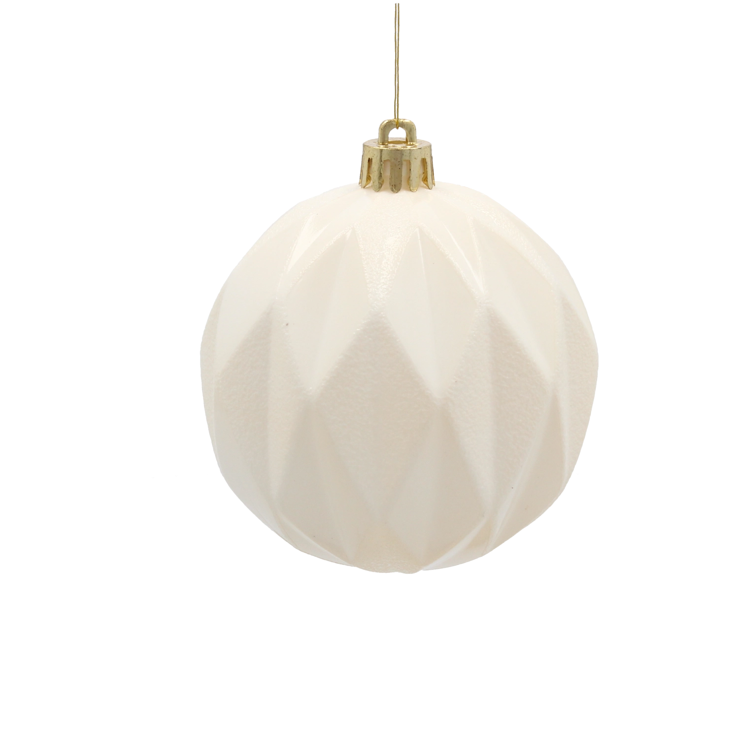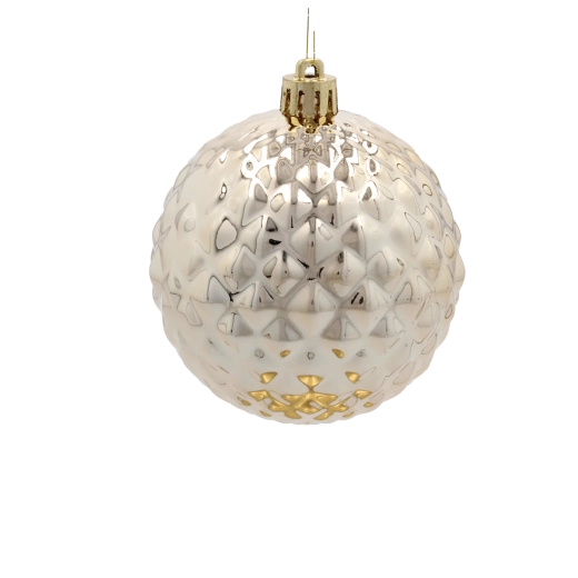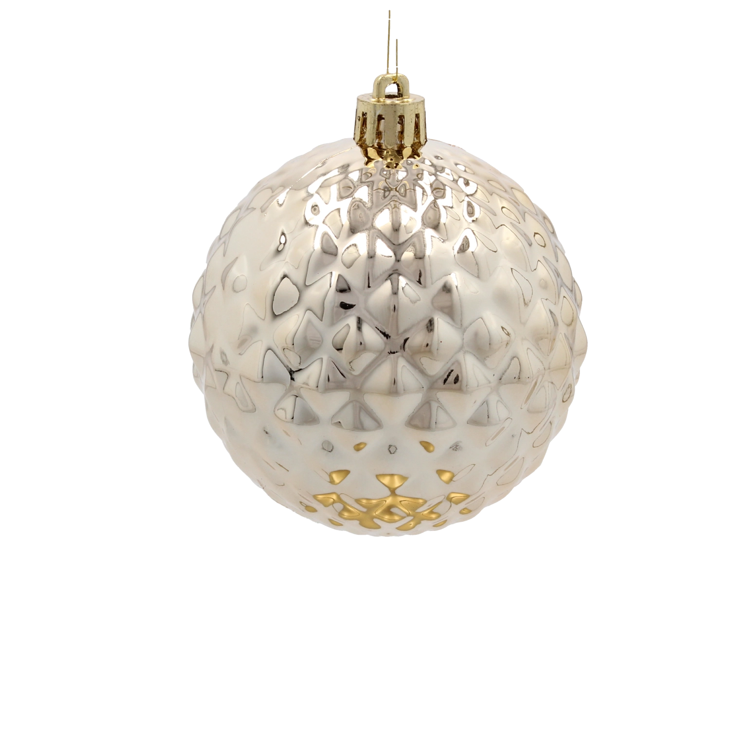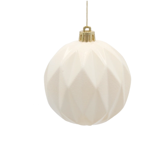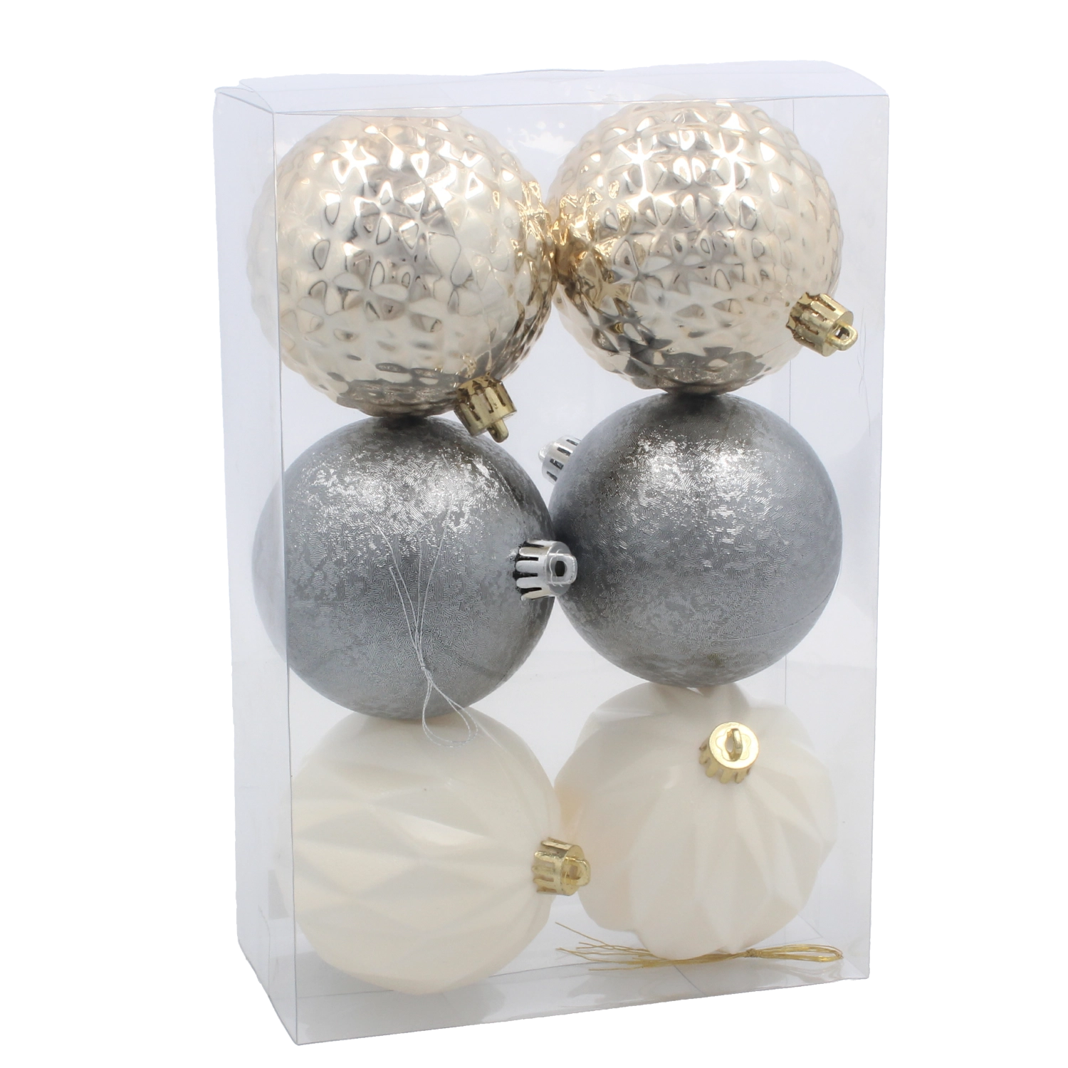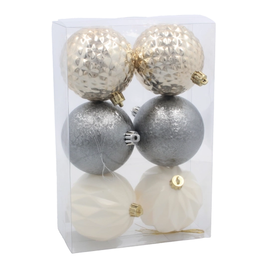 Ten starannie skomponowany zestaw szklanych bombek łączy teksturowane, matowe i gładkie wykończenia dla subtelnego, nowoczesnego efektu. Paleta kolorów w odcieniu szampańskim, srebrnym i białym łatwo łączy się z innymi dekoracjami, tworząc spójny wygląd bez wizualnego chaosu.