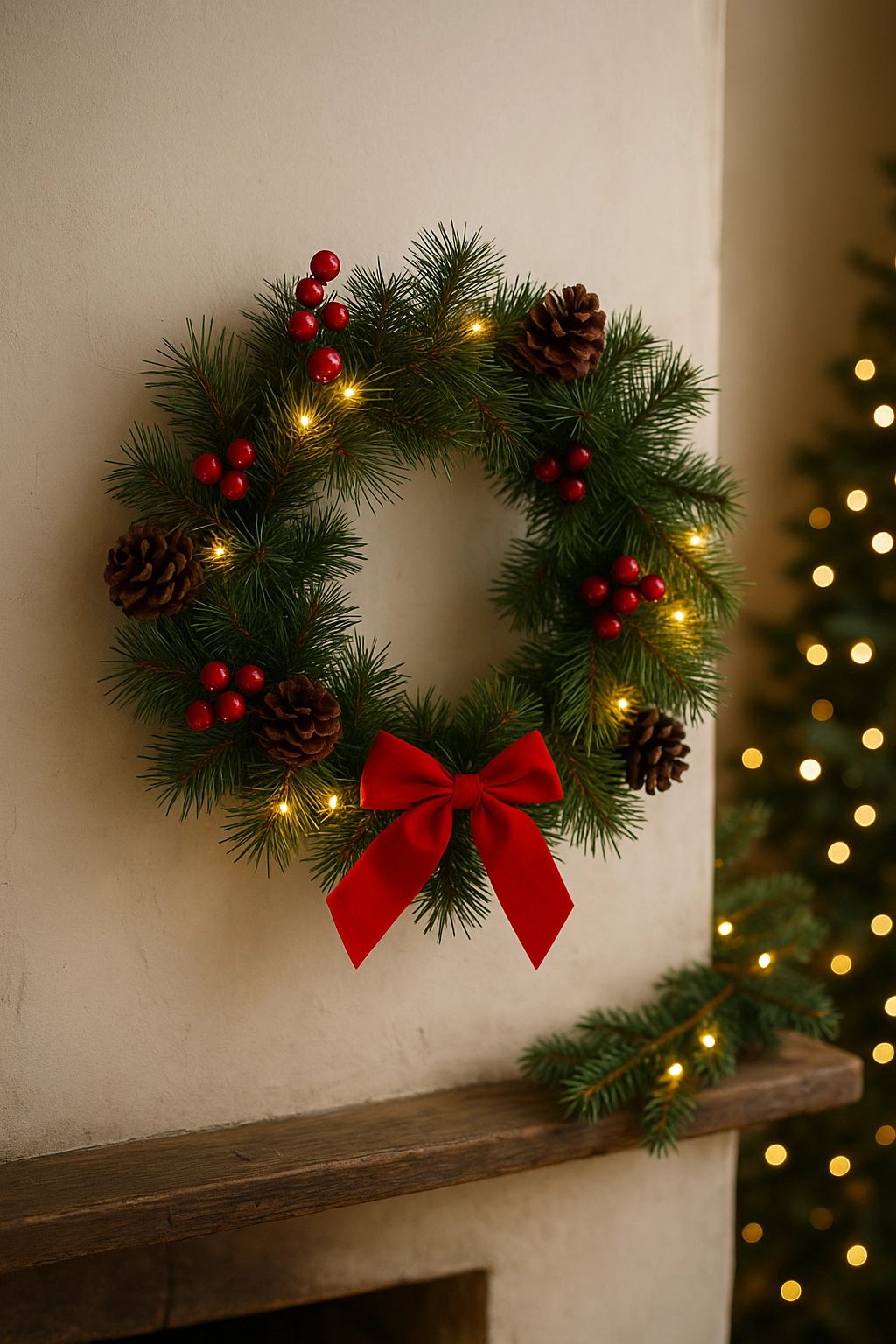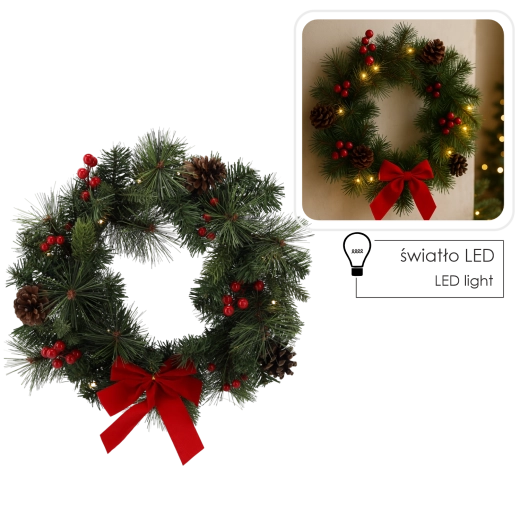 Zintegrowane 15 ciepłych białych diod LED równomiernie rozświetla wieniec i podkreśla ozdoby, szyszki oraz wstążkę – idealne na wieczorne chwile relaksu.
