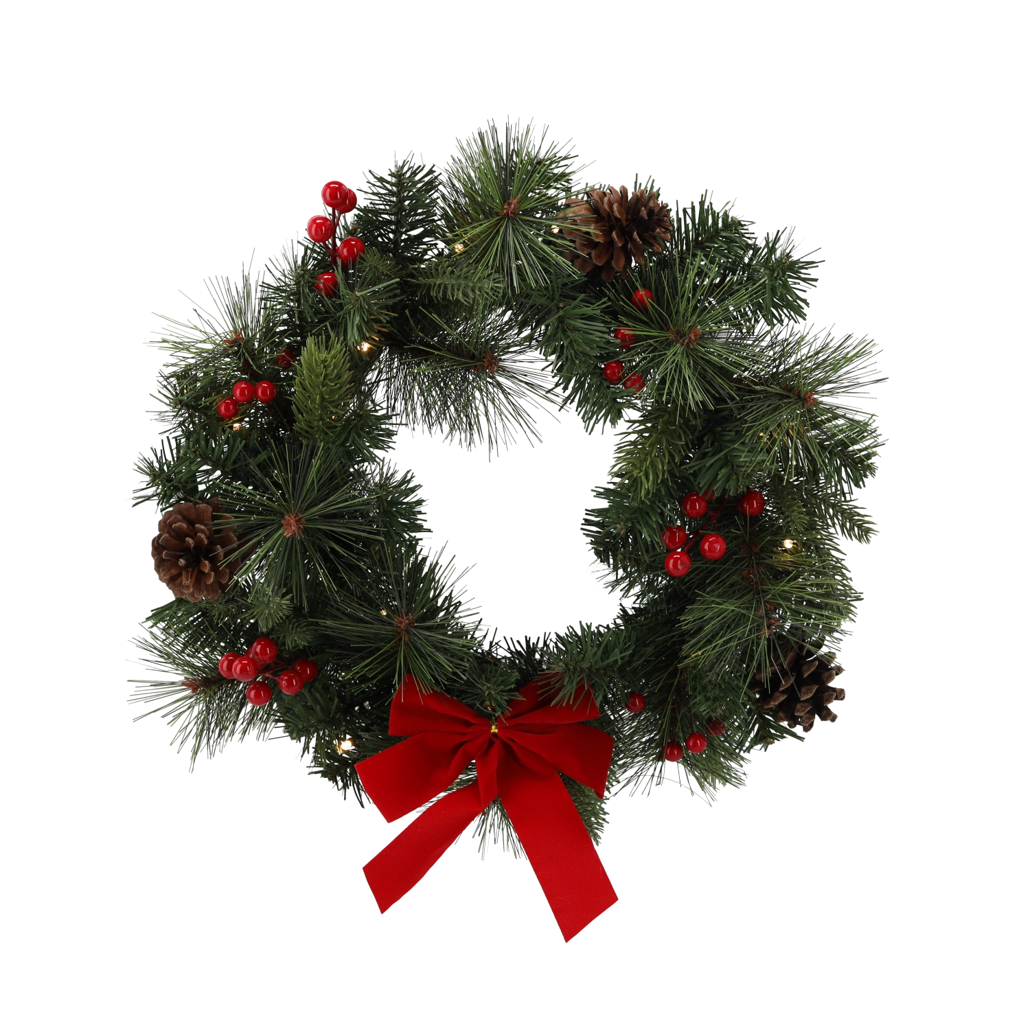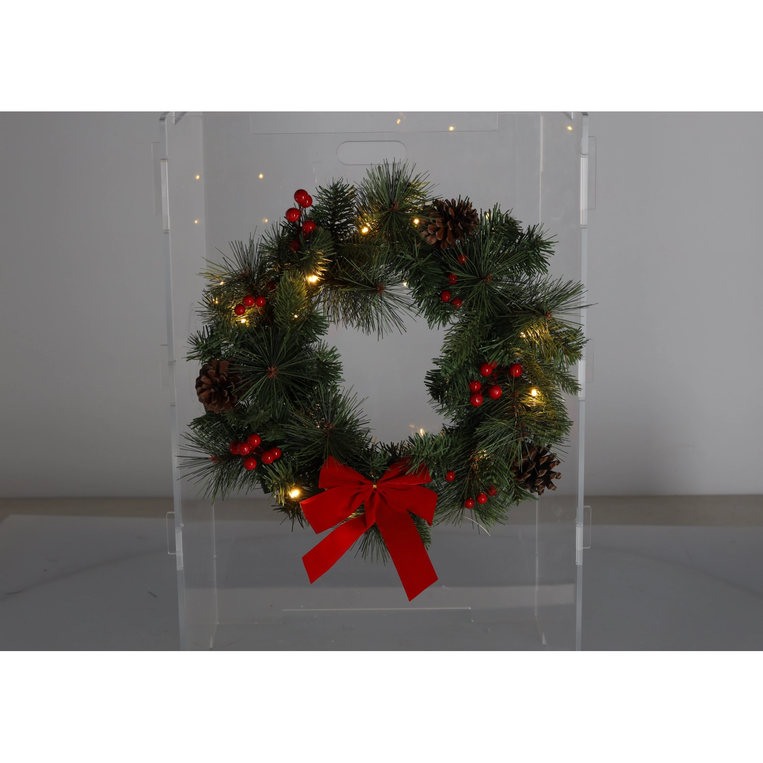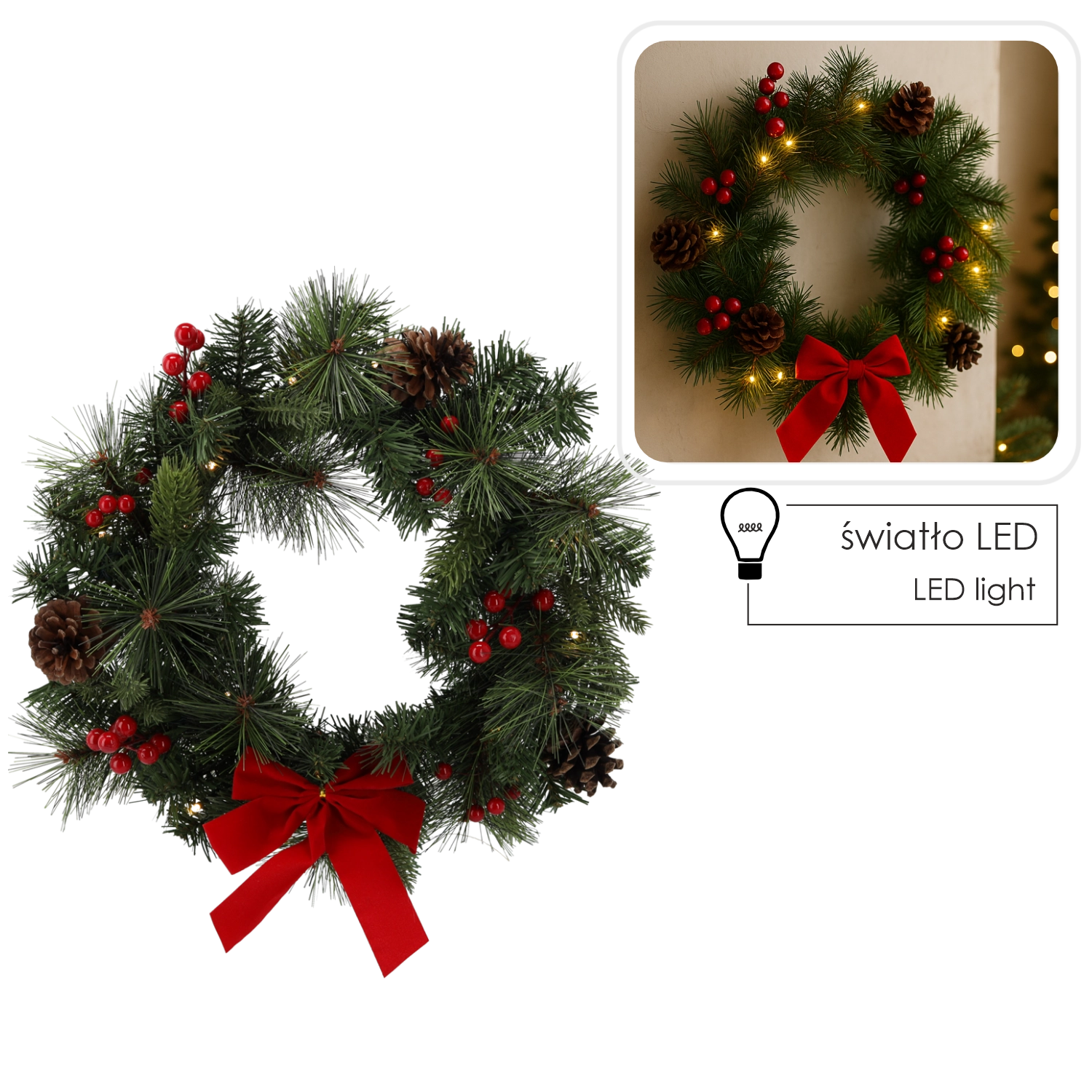 Elegancki wieniec bożonarodzeniowy o średnicy 40 cm z 15 ciepłymi białymi diodami LED wprowadzi do Twojego domu magiczną, świąteczną atmosferę. Dzięki zasilaniu bateryjnemu z łatwością umieścisz go na drzwiach, ścianie lub w oknie. Czerwone i złote dekoracje z szyszkami i wstążką nadają mu tradycyjny wygląd, a wysokiej jakości materiały zapewniają długą żywotność i możliwość ponownego wykorzystania co sezon.