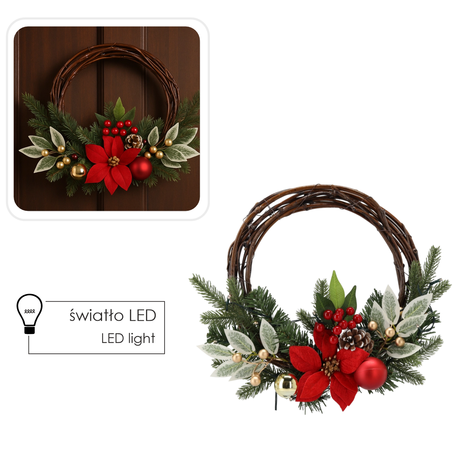 Wprowadź do swojego wnętrza tradycyjną, świąteczną magię. Ten wieniec wykonany jest z wysokiej jakości wikliny i zdobiony bogatą mieszanką zieleni, jagód, szyszek oraz czerwono‑złotych akcentów. Delikatne oświetlenie LED podkreśla detale i tworzy przyjemną scenerię świetlną przez całe święta.