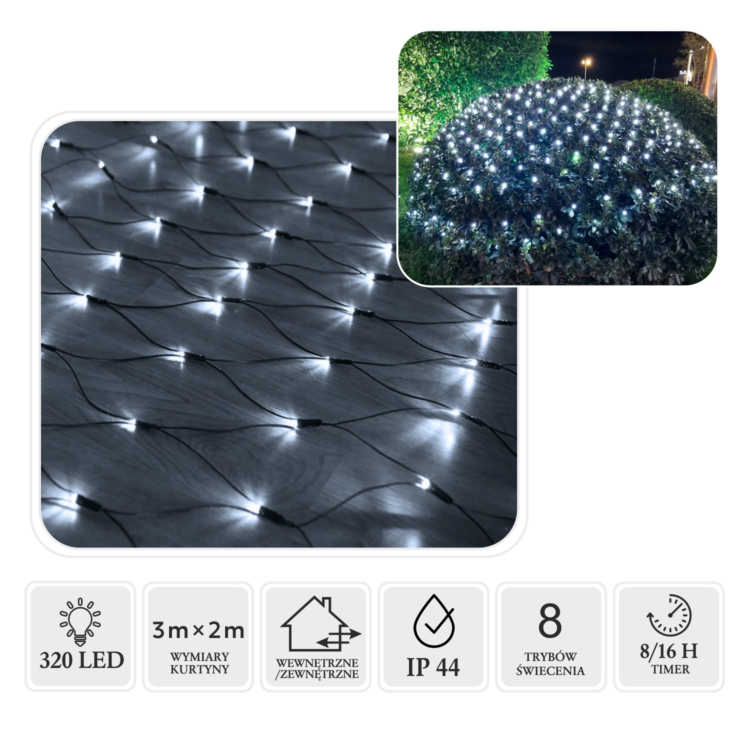 Rozświetl swój dom i ogród stylowym światłem. Ta świetlna kurtyna siatkowa z 320 diodami LED w zimnobiałym odcieniu oferuje 8 trybów świecenia, pamięć ostatniego ustawienia oraz timer 8/16 h. Dzięki klasie szczelności IP44 idealnie nadaje się do użytku na zewnątrz i wewnątrz, a dzięki wymiarom 3 × 2 m niezawodnie pokryje dużą powierzchnię.