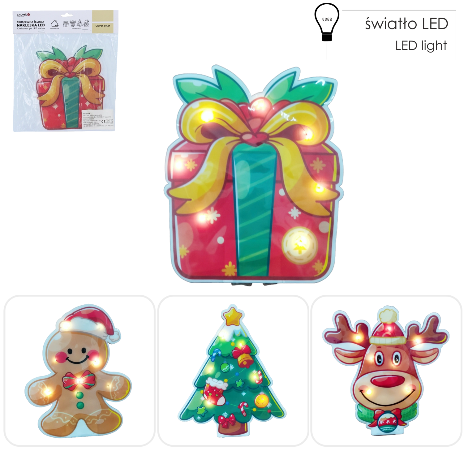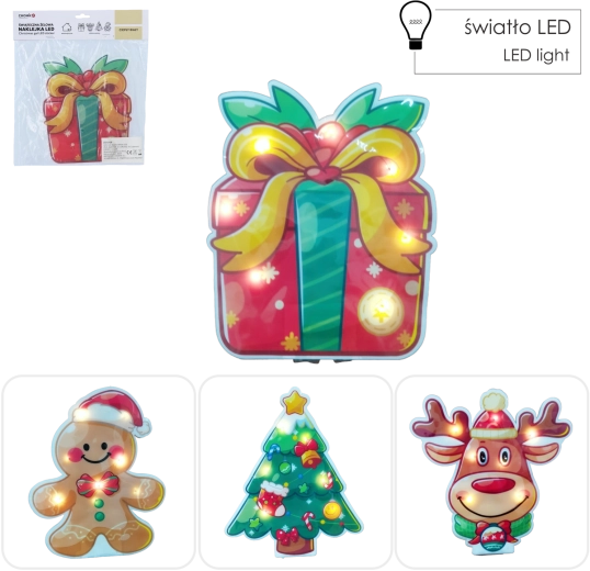 Rozświetl swój dom magią Świąt dzięki dekoracyjnej żelowej naklejce z LED. Wybierz motyw choinki, prezentu, renifera lub pierniczka i wyczaruj przytulną atmosferę ciepłym białym światłem. Naklejka łatwo mocuje się do szkła, lustra lub mebli, działa na baterię i nie wymaga przewodów. Szybka dekoracja na okna i do pokoju dziecięcego.