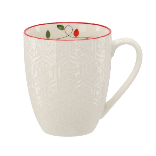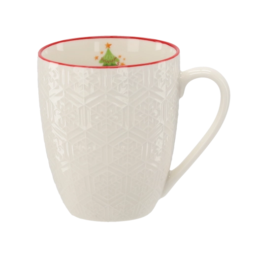 Ciesz się zimową atmosferą z tym eleganckim porcelanowym kubkiem o pojemności 400 ml, ozdobionym delikatnym reliefem, świątecznymi motywami i czerwonym rantem. Idealny na gorącą herbatę, kawę lub kakao, doskonale dopełni świąteczny nastrój i stanie się stylowym dodatkiem do kuchni.