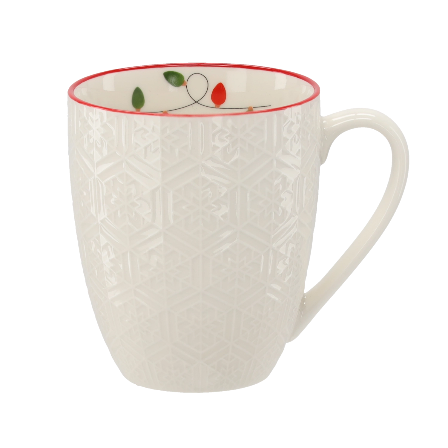 Delikatny geometryczny relief w połączeniu z czerwonym rantem nadaje kubkowi wyjątkowy wygląd, który podkreśla świąteczną atmosferę podczas każdego posiłku.