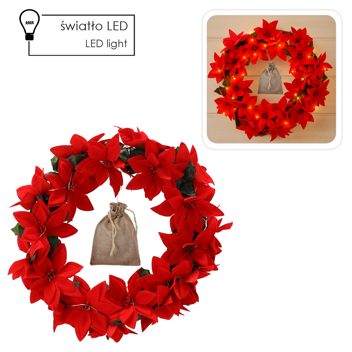 Wprowadź do swojego domu magiczny, świąteczny nastrój dzięki dekoracyjnemu wieńcowi w tradycyjnym czerwonym kolorze kwiatów gwiazdy betlejemskiej. Zintegrowane 30 diod LED tworzy przyjemne, równomierne oświetlenie bez nagrzewania i o niskim zużyciu energii. Praktyczne zasilanie bateryjne 3× AA umożliwia umieszczenie na drzwiach, stole lub półce bez potrzeby gniazdka.