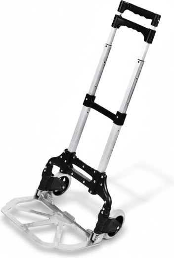 Praktyczny wózek z aluminium łączy niską masę, solidną konstrukcję i szybkie składanie w kilka sekund. Teleskopowa rączka umożliwia wygodną obsługę użytkownikom o różnym wzroście, a duża składana łopata gwarantuje stabilne podparcie dla pudeł i paczek.