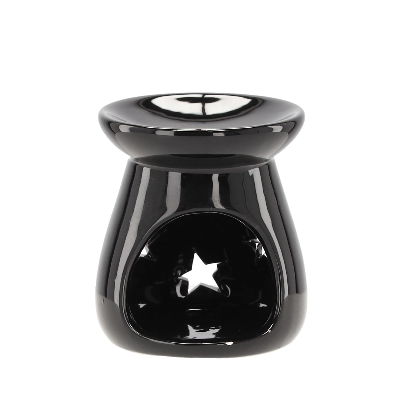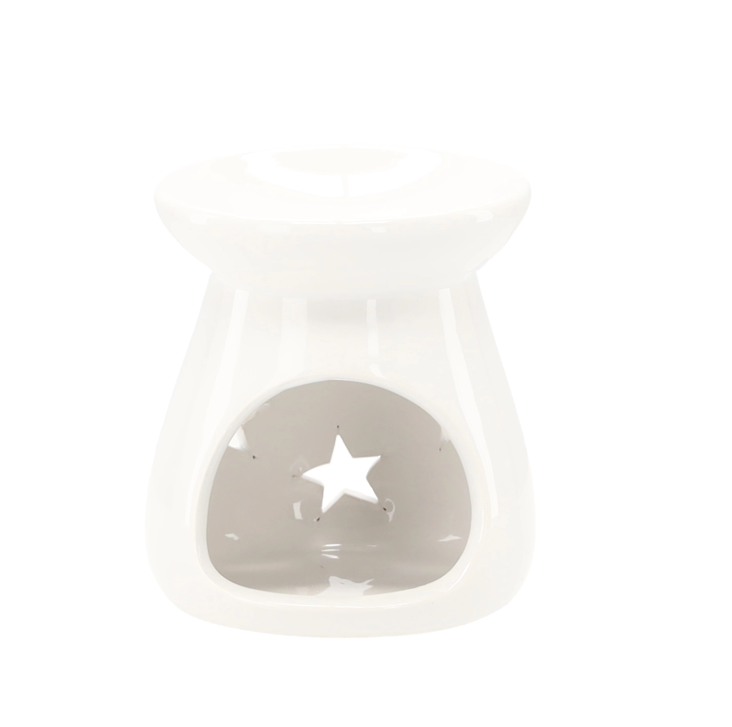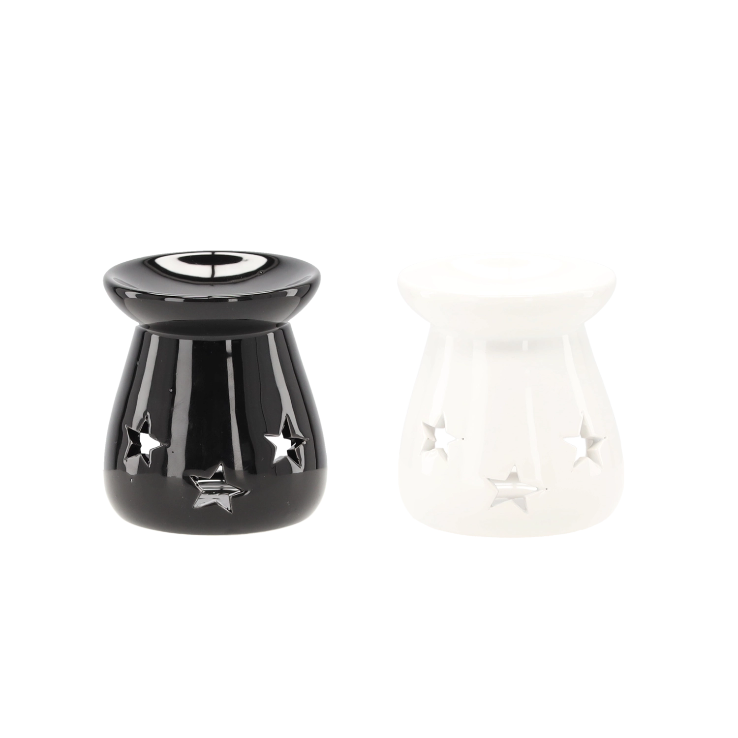 Stylowa aromalampka z glazurowanej ceramiki zapewnia subtelne efekty świetlne dzięki wycięciom w kształcie gwiazd. Górna misa przeznaczona jest na wosk zapachowy lub olejki eteryczne, dolny otwór mieści klasyczną świeczkę tealight. Kompaktowe wymiary 7 × 8 cm umożliwiają ustawienie na półce, stoliku kawowym czy parapecie.