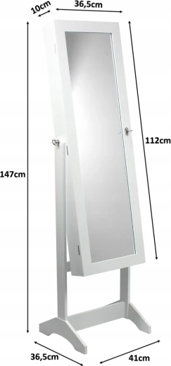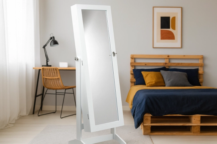 Dzięki smukłej konstrukcji i stabilnej podstawie oszczędza miejsce, a jednocześnie zapewnia odbicie całej sylwetki do wygodnego przymierzania stylizacji. Minimalistyczne białe wykończenie z łatwością dopasujesz do nowoczesnych i klasycznych wnętrz — stylowy akcent, który podkreśli charakter sypialni i garderoby.
