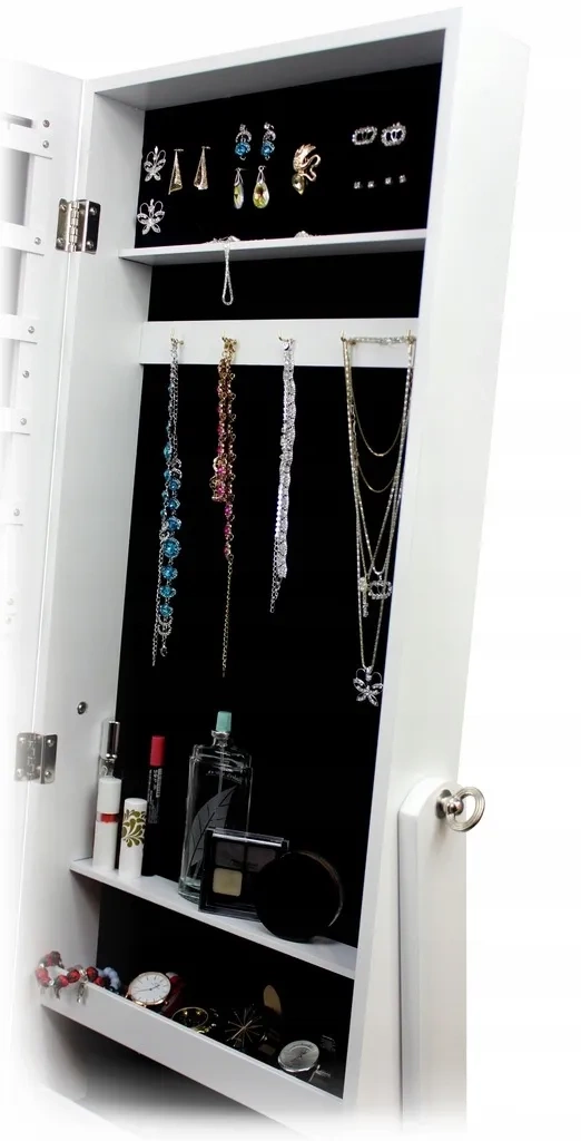 Wewnątrz znajdziesz haczyki na naszyjniki, sloty na kolczyki, listwy na pierścionki, półeczki na zegarki i kosmetyki — wszystko przejrzyście w jednym miejscu.