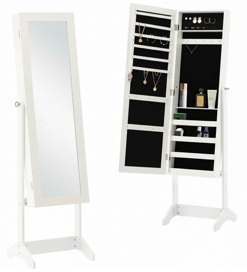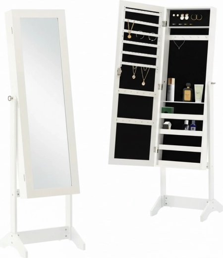 Ta wolnostojąca szkatułka z pełnowymiarowym lustrem idealnie sprawdzi się w sypialni, garderobie i przedpokoju. Biały, nowoczesny design łatwo łączy się z większością aranżacji, a miękkie wyściełanie wewnątrz delikatnie chroni Twoje kosztowności. Dzięki zamknięciu na kluczyk Twoje skarby zawsze pozostaną bezpieczne.