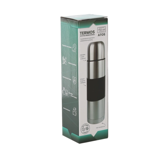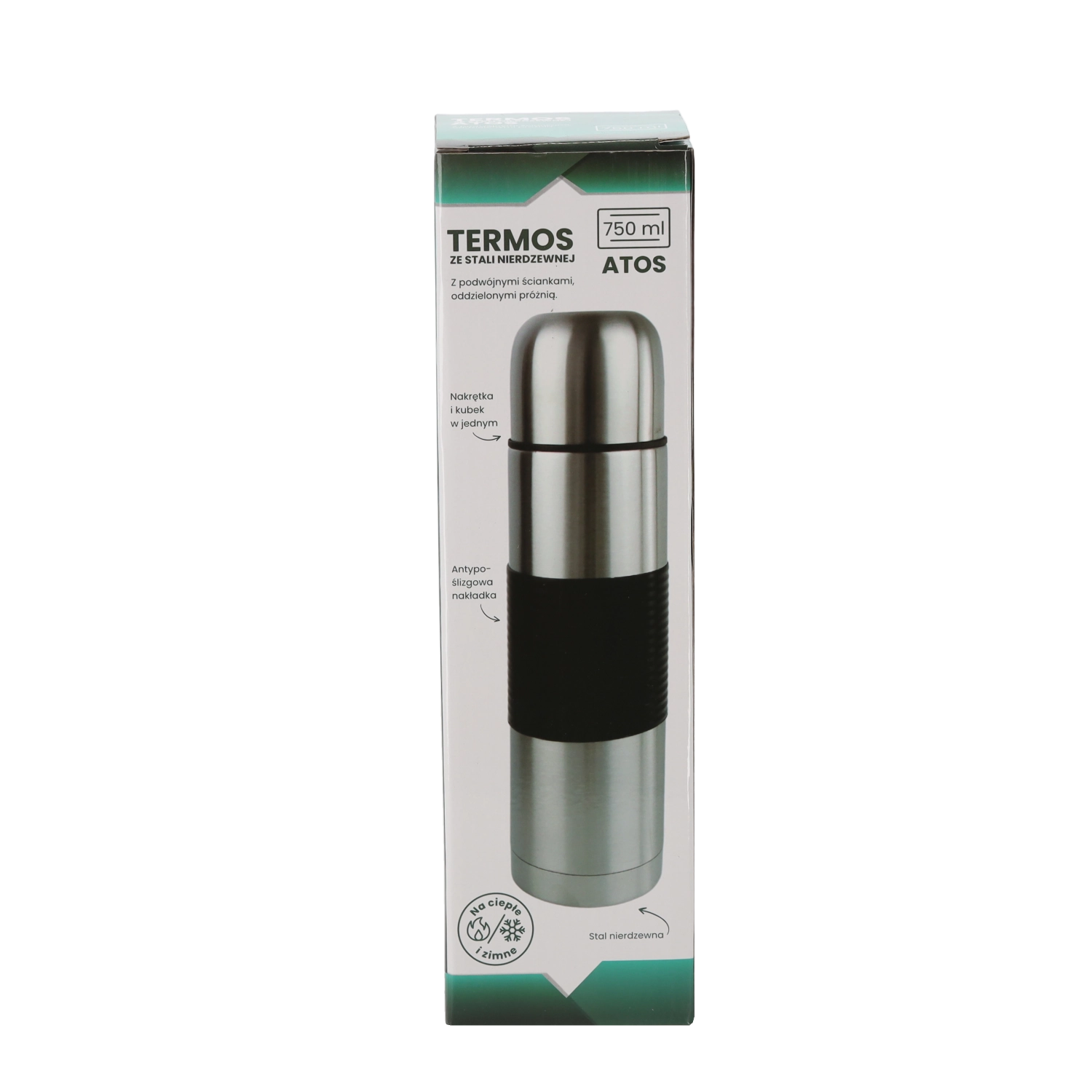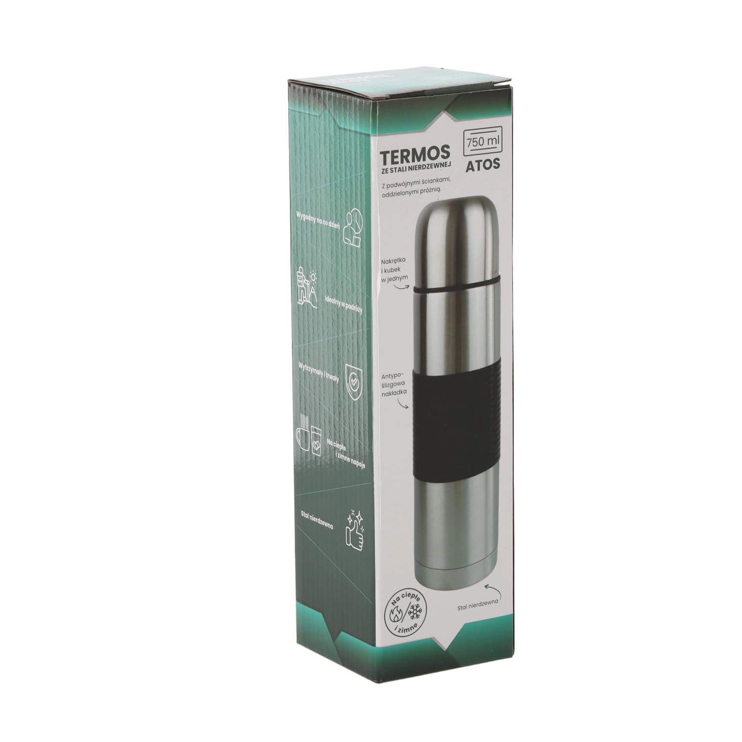 Praktyczny termos ATOS o pojemności 750 ml utrzyma Twój napój długo ciepły lub zimny dzięki podwójnym ściankom ze stali nierdzewnej oraz wygodnemu antypoślizgowemu uchwytowi silikonowemu. Wysoka izolacja termiczna sprawia, że nawet po 24 godzinach napój pozostaje przyjemnie ciepły.