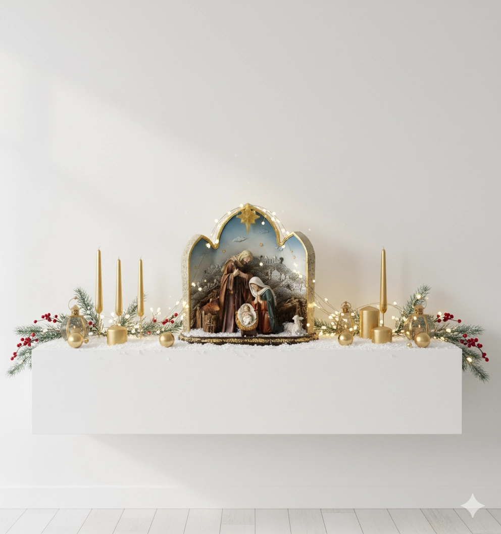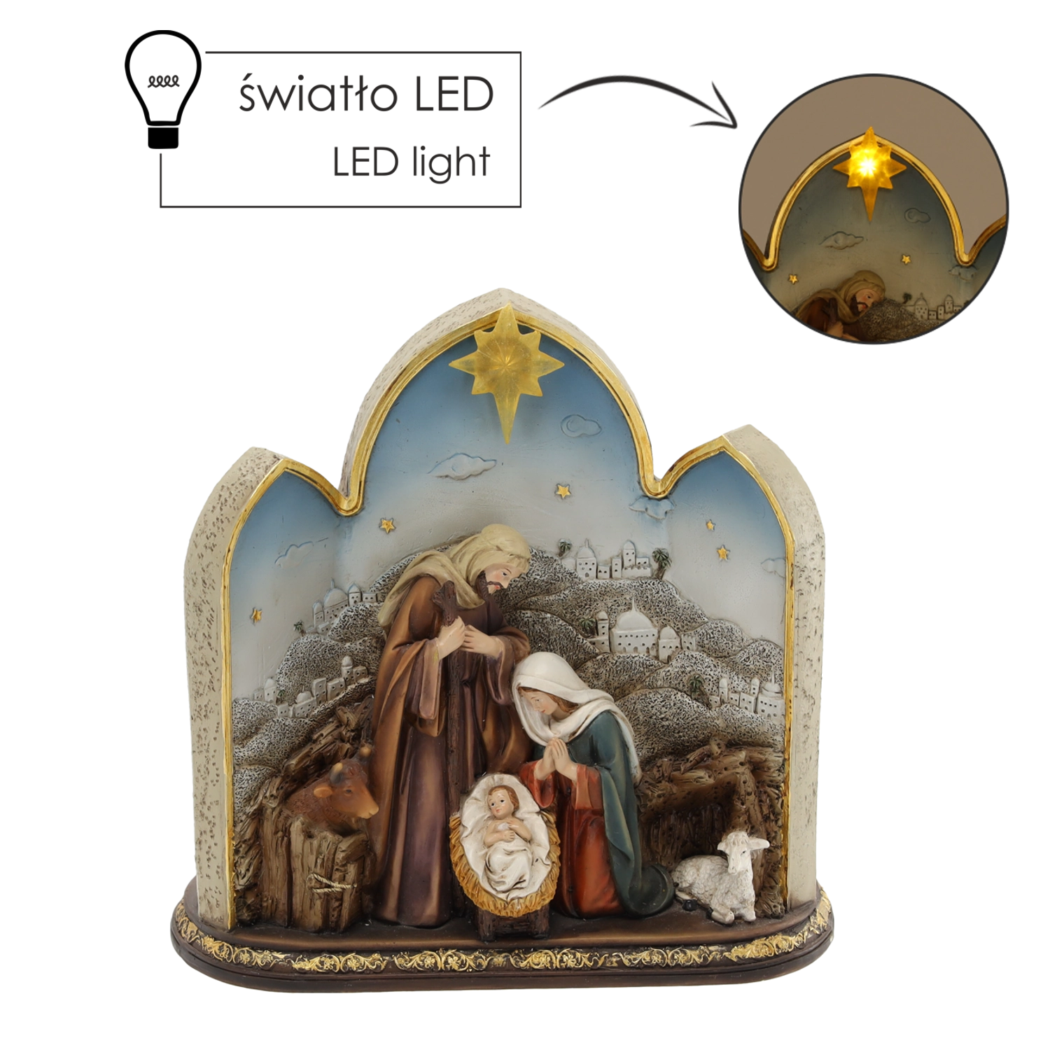 Ta dekoracyjna figurka szopki ze Świętą Rodziną w łukowej ramie z subtelnymi złotymi akcentami wprowadza tradycyjny motyw Bożego Narodzenia w nowoczesnym wydaniu. Ciepłe podświetlenie LED gwiazdy tworzy przyjemną atmosferę i dodaje aranżacji odświętnego charakteru.