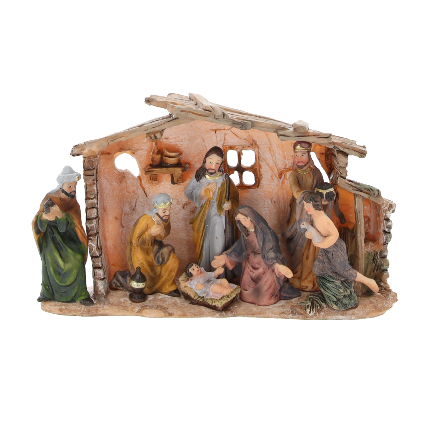 Wnieś do domu magię Świąt dzięki eleganckiej szopce, która przedstawia Świętą Rodzinę, pasterzy i Trzech Króli pod rustykalną stajenką. Figurki są szczegółowo wykonane i ręcznie malowane, co nadaje im niepowtarzalny wygląd. Kompaktowe wymiary sprawiają, że ta dekoracja to idealna ozdoba świąteczna na komodę, półkę lub gzyms kominka. Trwała żywica poliresinowa zapewnia długą żywotność i piękny wygląd rok po roku.
